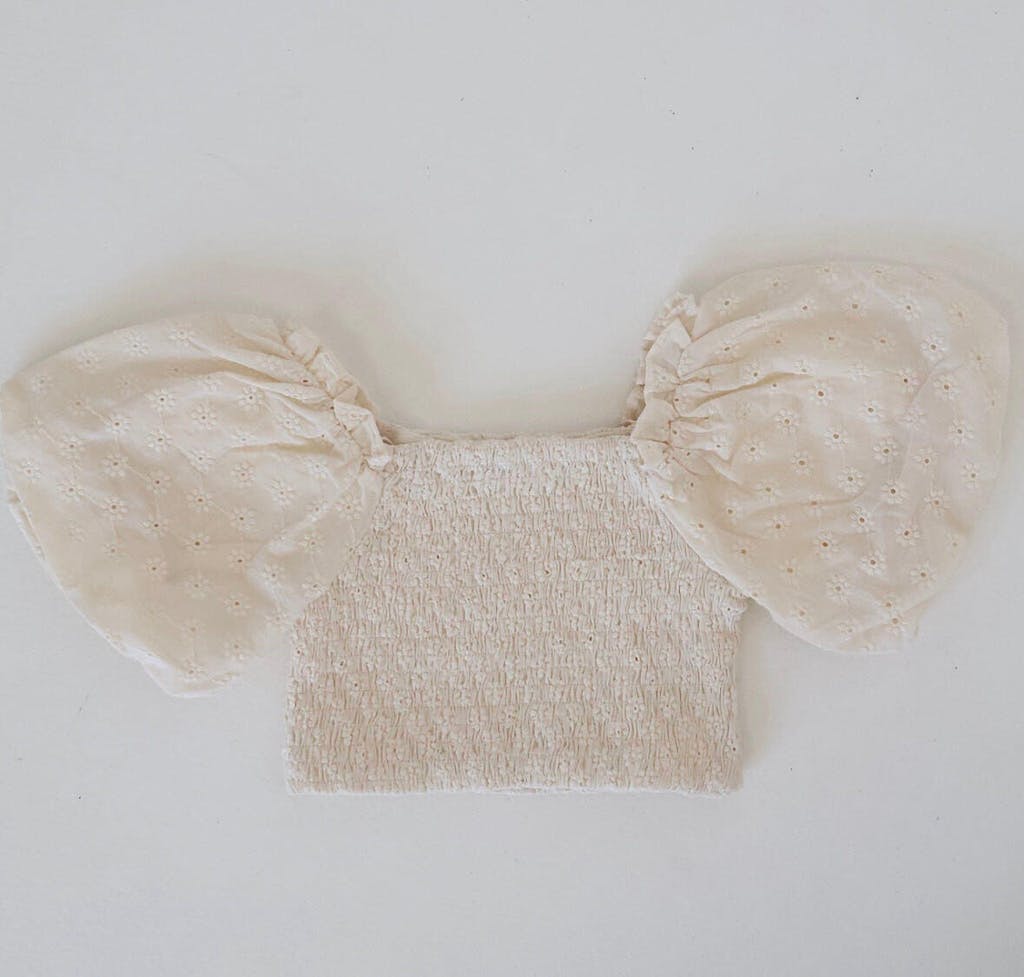 This gorgeous Mini Puff Sleeve crop is made from our gorgeous broderie anglaise featuring dainty flowers within the lace and lined with a gorgeous soft cotton. It features beautiful puff sleeves with elasticated arm holes and shirring across the waist. This goes perfect with our overalls or can be a statement piece on its own.