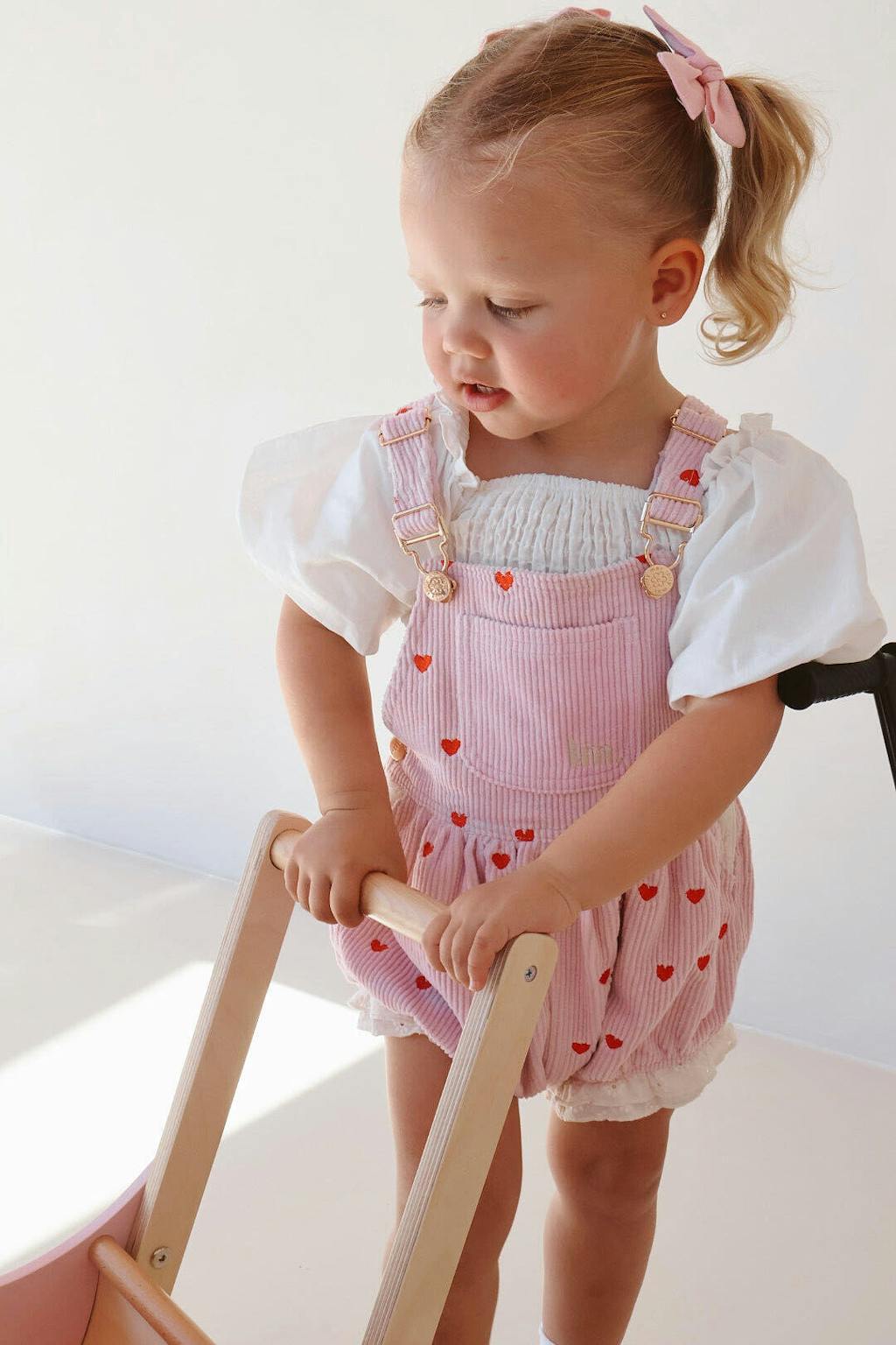 Our Signature Bubble Overalls are made from the softest 100% pure cotton corduroy in a gorgeous blush hue. They feature custom heart embroidery throughout the body complimented by our highest quality custom gold coloured hardware. There is gorgeous lace detailing in the pockets and leg cuffs.