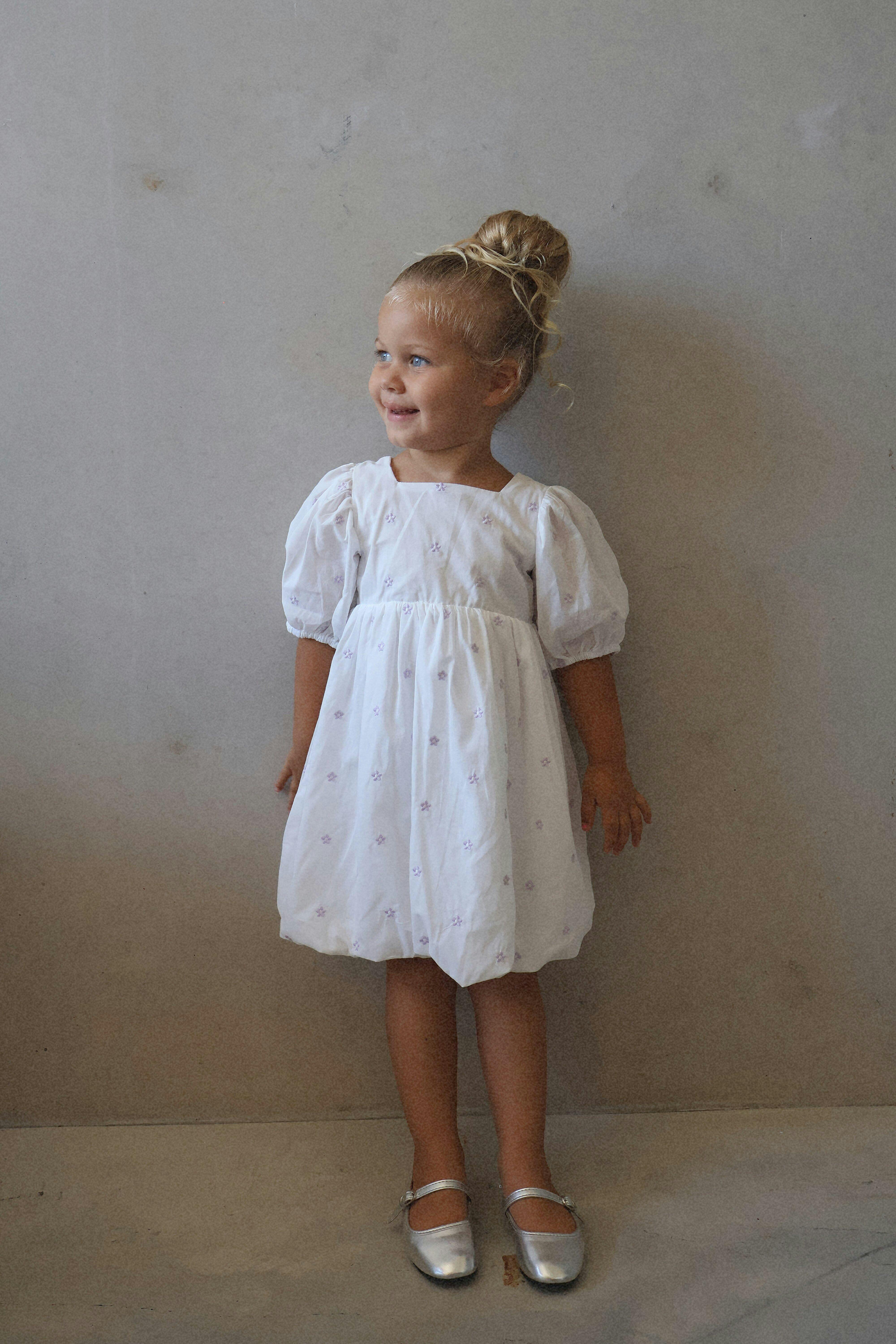 Our gorgeous puff dress in our crisp white cotton and custom hand embroidered Lilac daisy flowers is designed to be lightweight and airy for your little ones to wear. It is made from the softest cotton and double lined. It features the most delicate details including the puffy sleeves and bubble hemline. It also has a beautiful open back with dainty straps to be tied into a bow and an invisible zip at the back for easy wear. Your darling will want to twirl into the moonlight with this little number on x