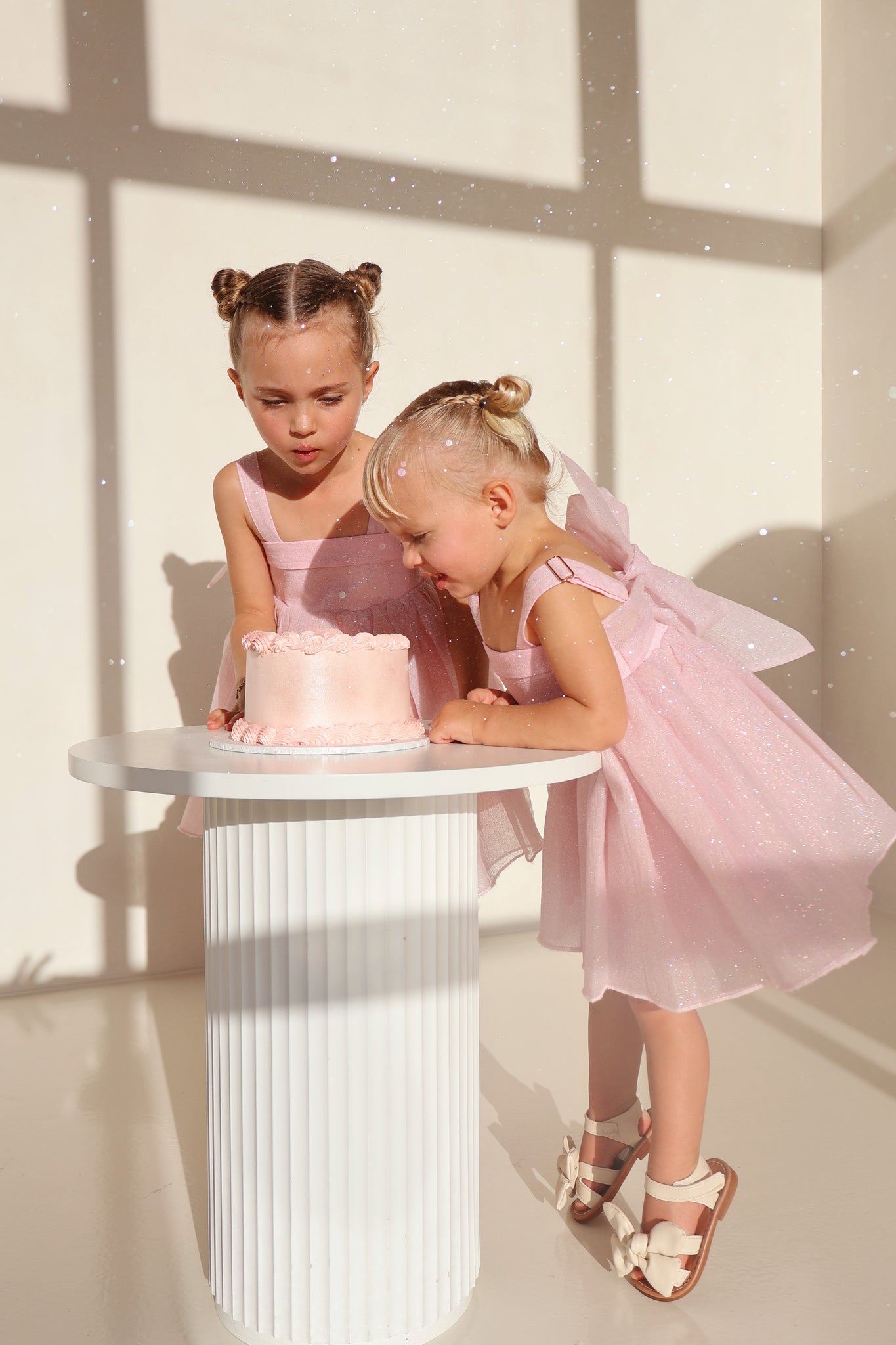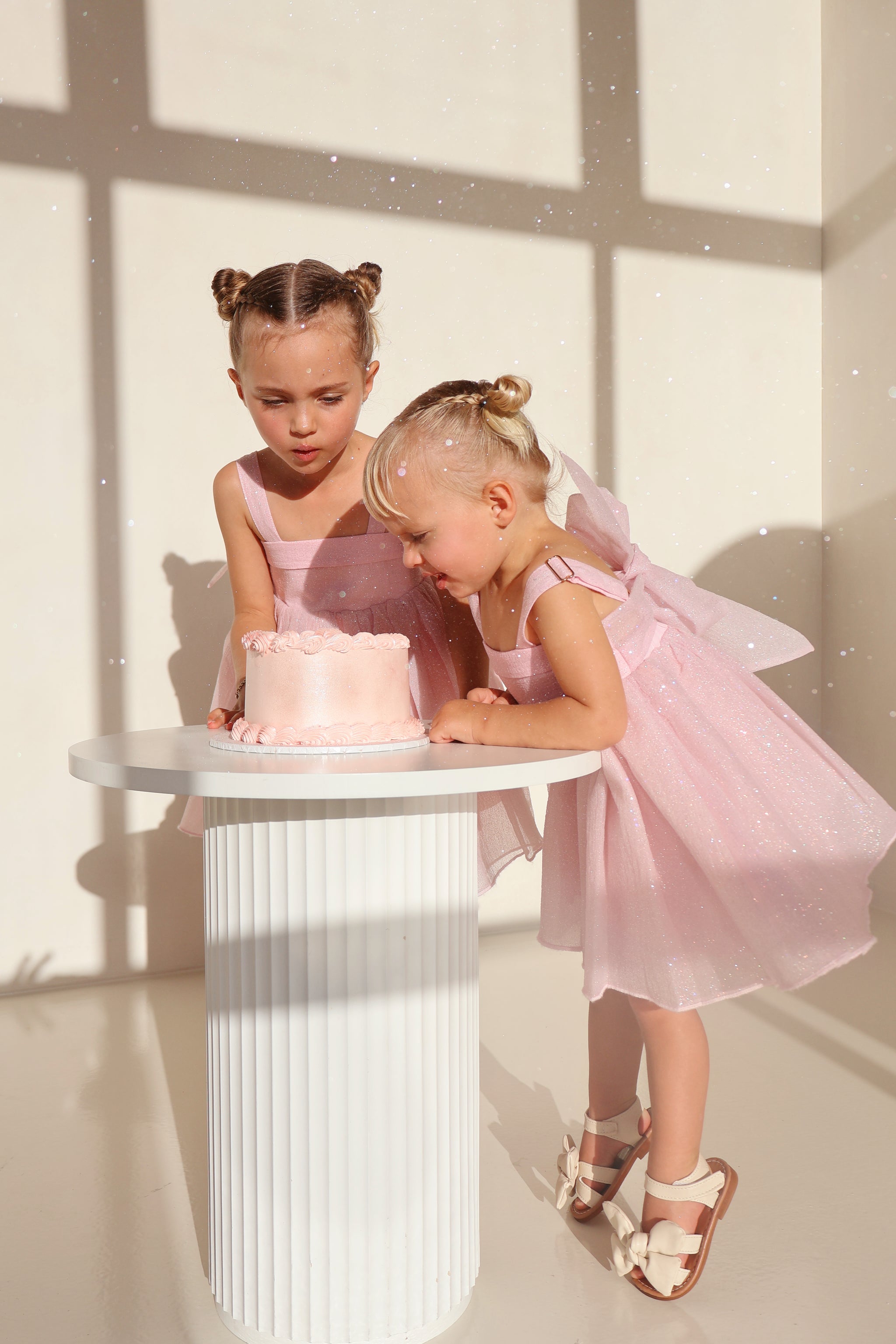 Our gorgeous sparkle cupcake dress is lined with 100% cotton in the body and also on the underlay of the adjustable straps in a beautiful baby pink glittery hue. She has five layers of fabric made up of tulle and glittery chiffon. Showcasing a cupcake skirt, fixed waist and elasticated detailing at the back with a gorgeous statement tie up bow. It’s show stopping in its design. This dress is perfect for every occasion and features high quality gold coloured hardware which makes the straps adjustable to compliment longevity of wear.