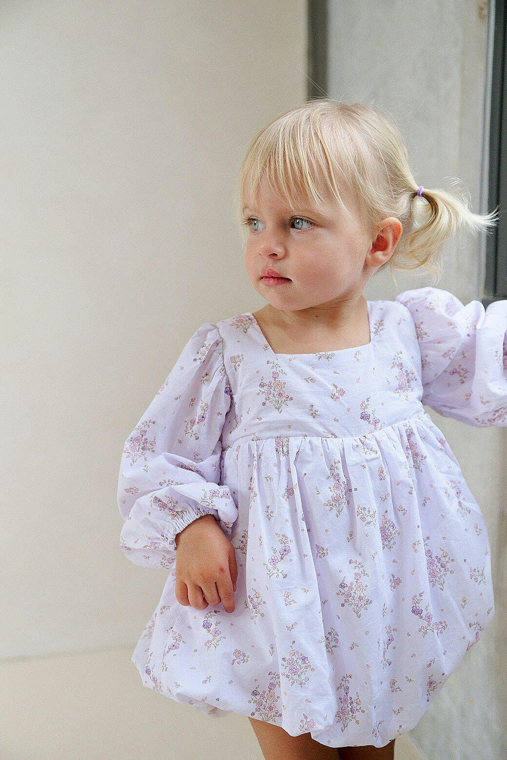 Our gorgeous new bubble romper in our exclusive hand painted Orchid floral print is designed to be lightweight and airy for your little ones to wear. It is made from the softest cotton and double lined. It features the most delicate details including the long puffy sleeves and a bubble hem. We have designed this piece with a beautiful big bow detail at the back, elasticated at the back for easy dressing. It also features snaps at the crotch. This romper is sure to be the next show stopping piece in your darlings wardrobe.