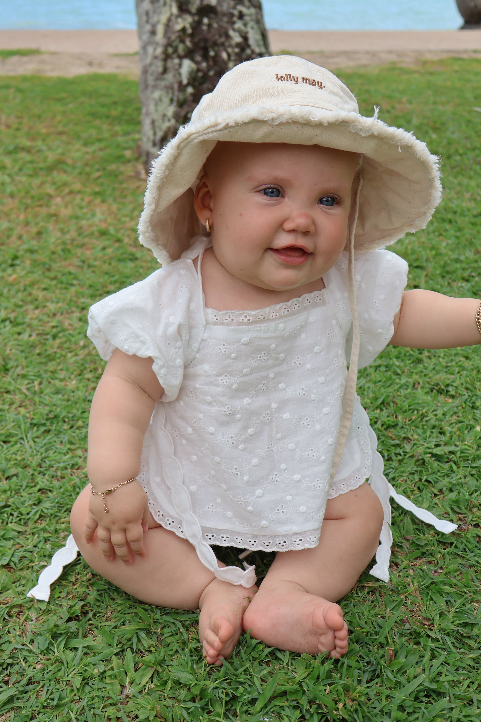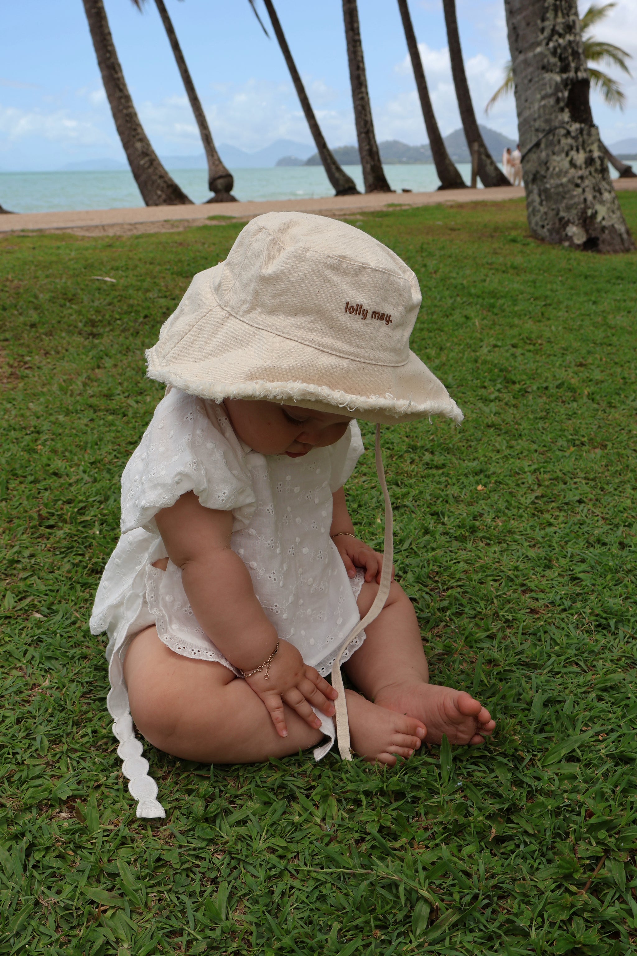 Introducing our gorgeous Lolly May embroidered signature bucket hat, The sweetest summer essential for days spent at the beach, park, or anywhere your darling loves to play. Crafted in our signature style, this beautiful piece features a soft, flexible wire inside the brim, allowing you to shape it any way your little love desires from a gentle wave to a full, floppy brim.
