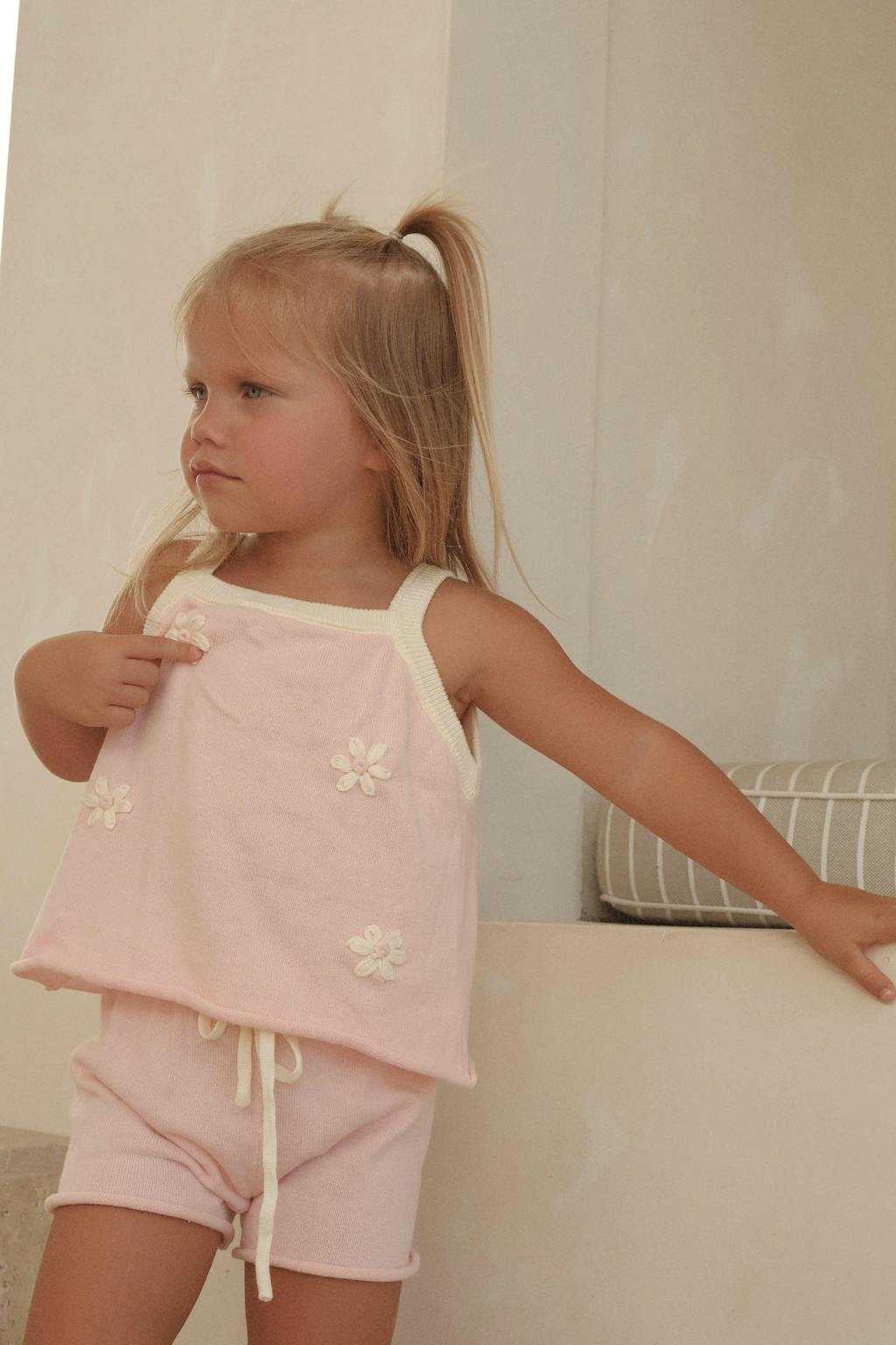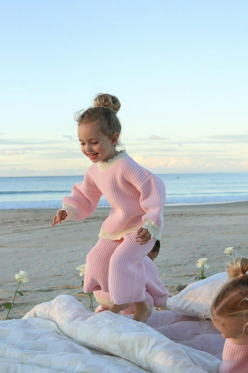 Our gorgeous Strawberries and Cream Knitwear Sets are made of 100% cotton in a gorgeous pink and cream. They are so soft and buttery and are perfect for all occasions. The knitted jumper has beautiful bubble sleeves complimented with a scalloped neckline and pretty little scallop wrist cuffs. The knitted pants have an elasticated waistline with a functional drawstring.