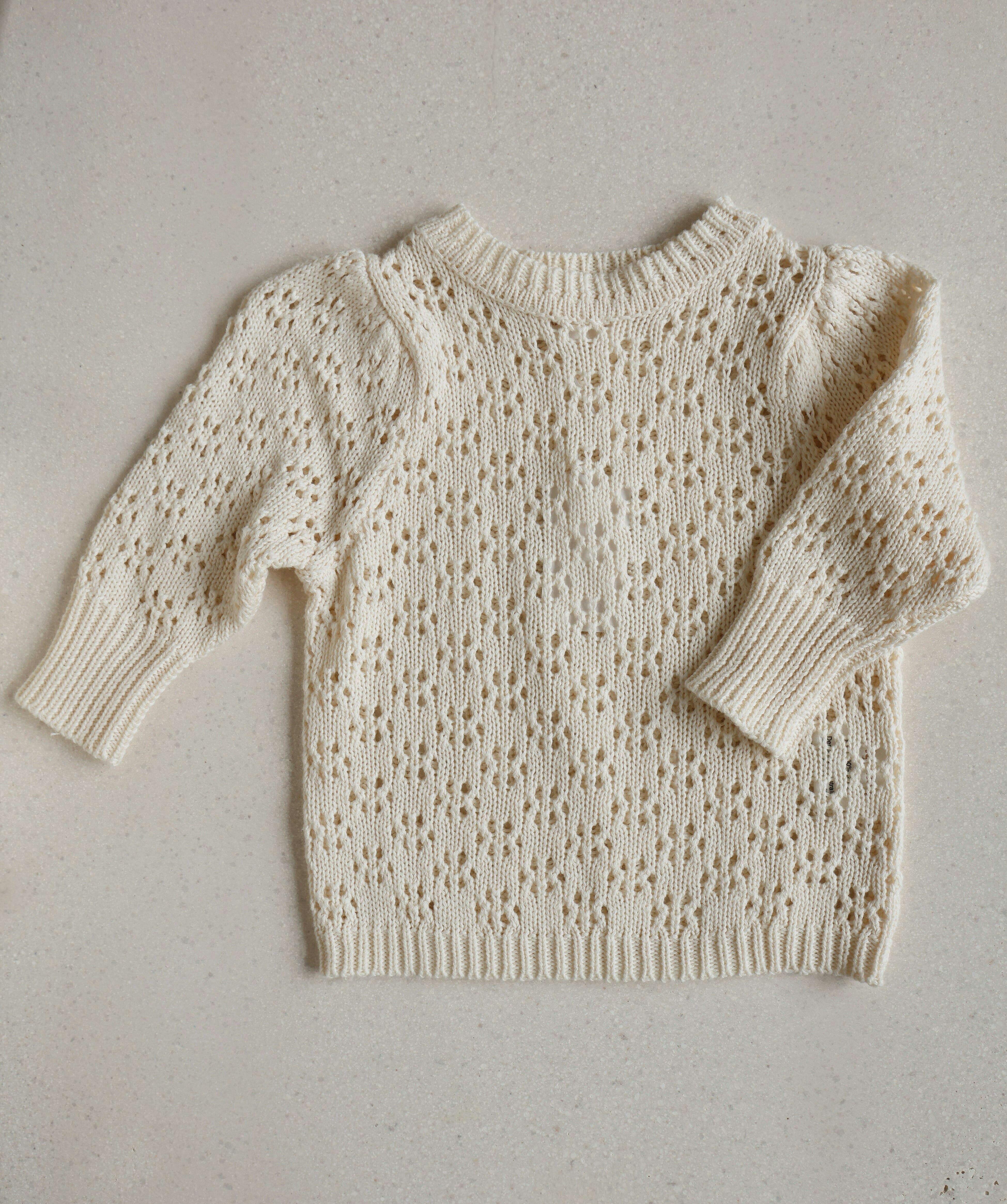 A cream knit in our exclusive crochet flower stitch made from 100% cotton, this dreamy cream knit is the layering essential every wardrobe needs. Lightweight yet warm, with soft stretch for everyday comfort. We recommend sizing up for a relaxed fit that grows with them.