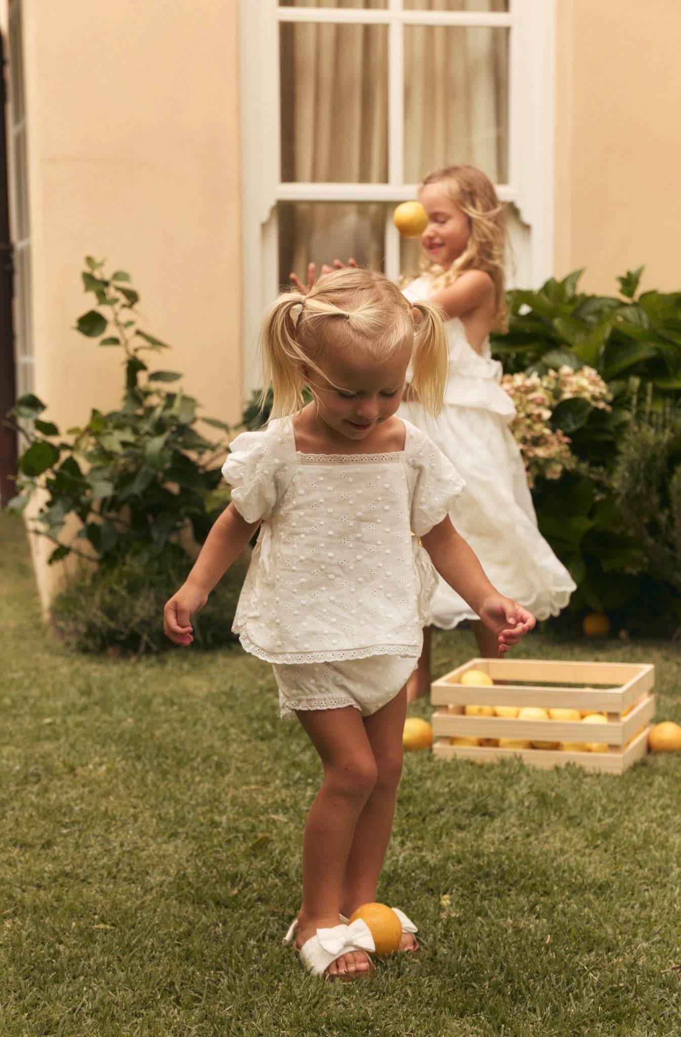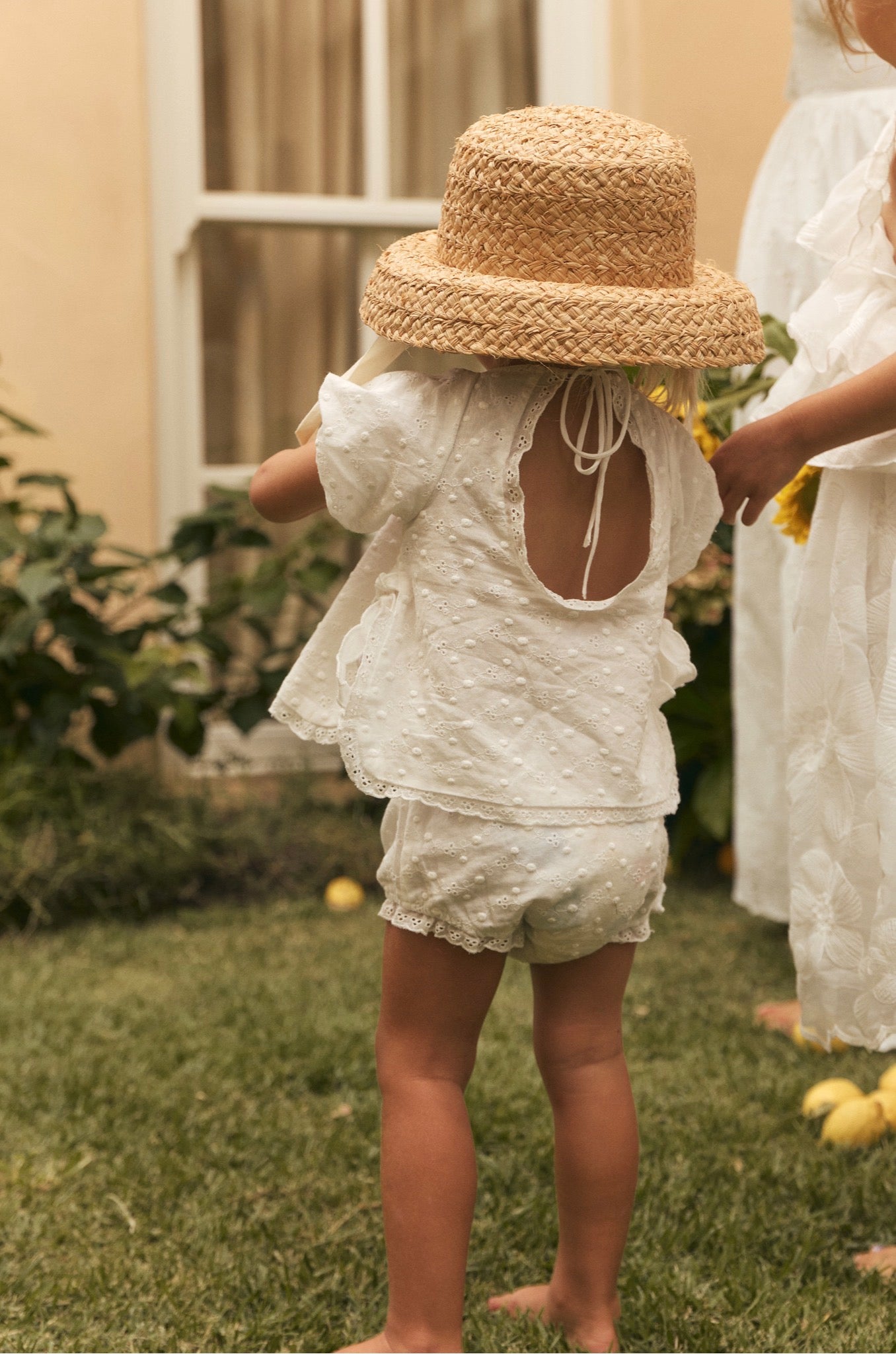 Our gorgeous Marshmallow Set is pure sweetness for your little darling. Crafted from a beautiful 100% cotton lace fabric, it features delicate lace trim around the keyhole and scalloped tie-up details on the sides, adding the perfect touch of flow and charm. Paired with matching soft cotton bloomers, this timeless and elegant set is perfect for special occasions, celebrations, or simply those precious everyday moments.