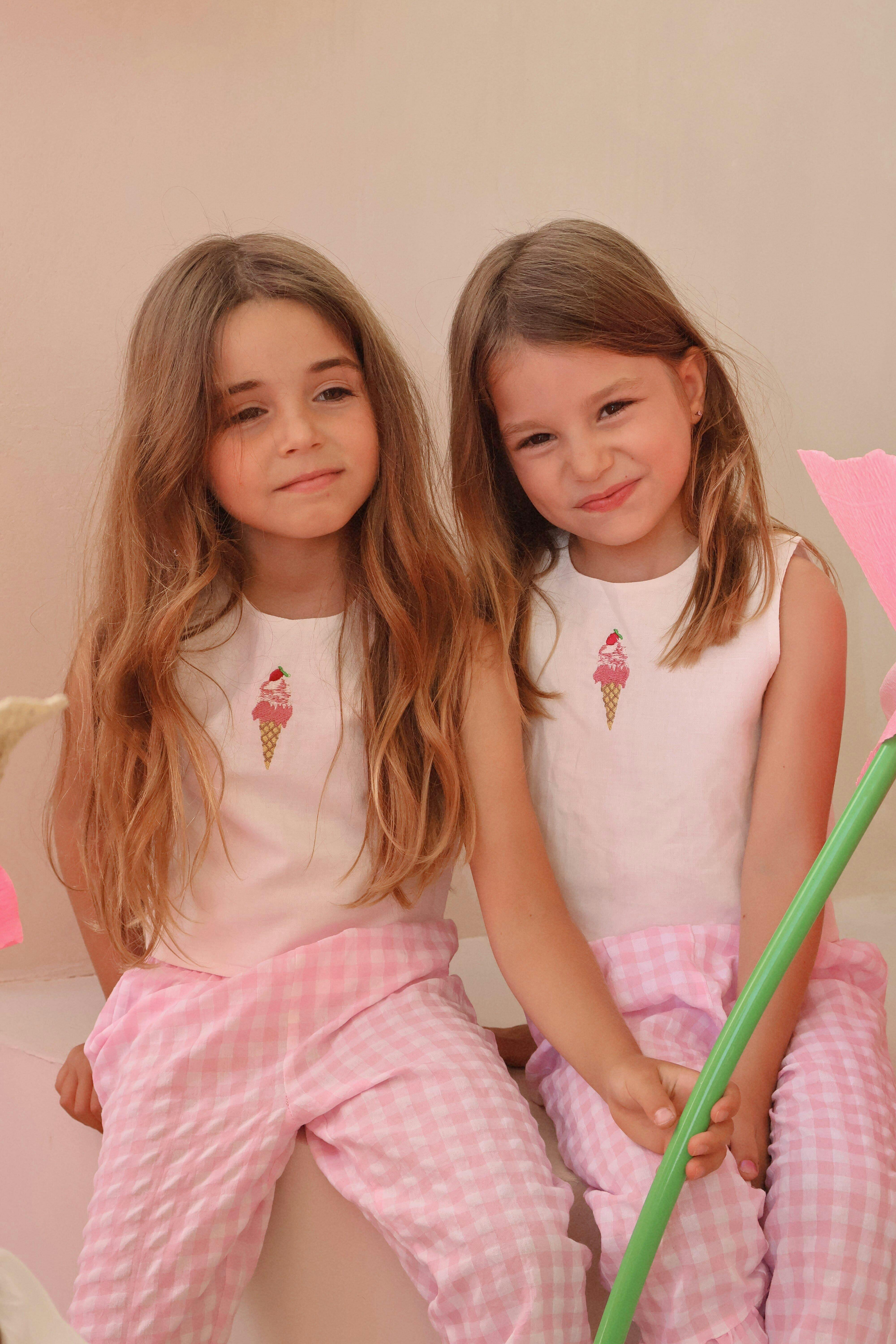 Our gorgeous linen crop top features the most delicate embroidered detail on the front in our signature strawberry ice cream. It also has the cutest pink gingham buttons at the back which goes perfectly with our garden pants!