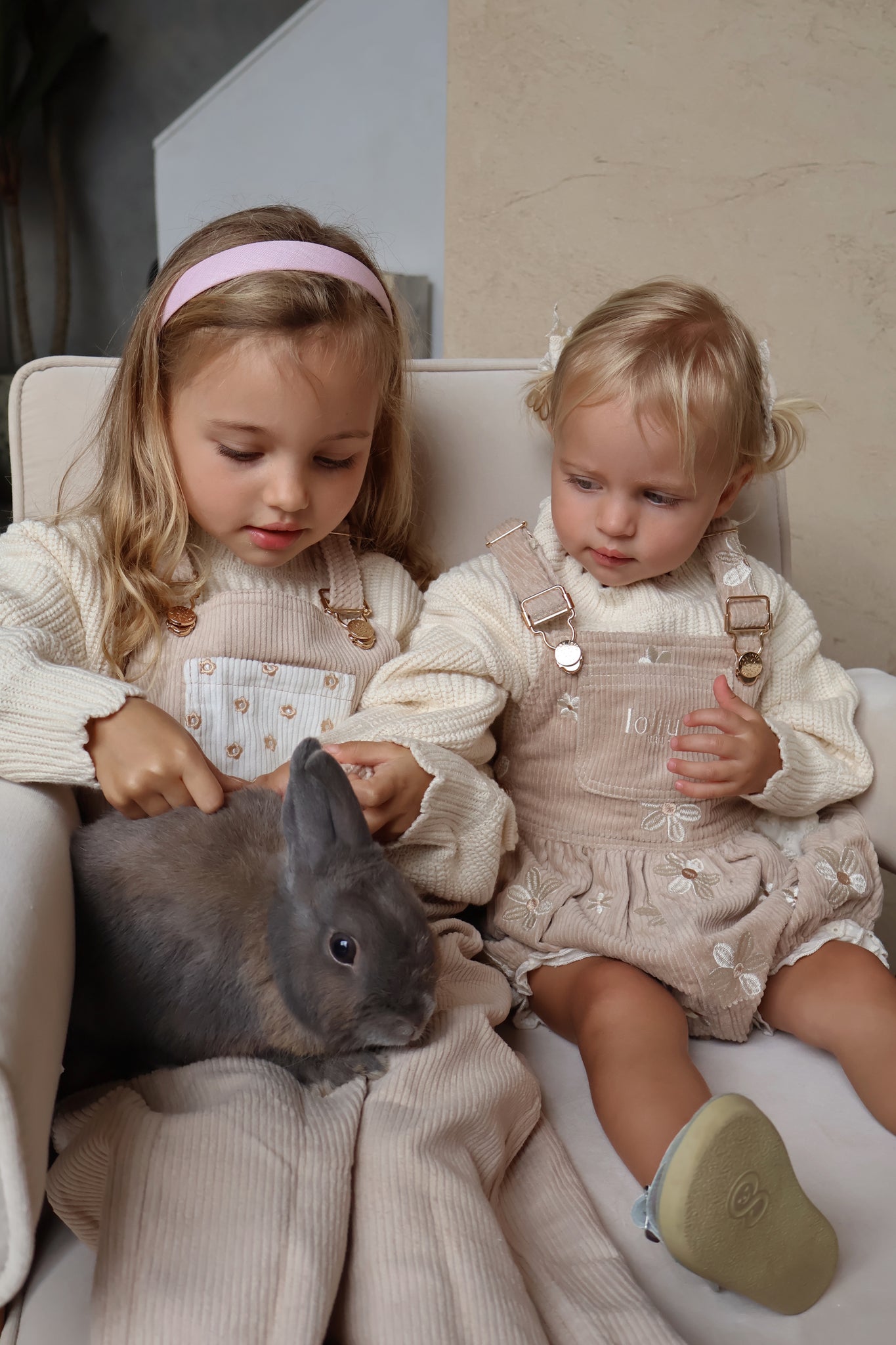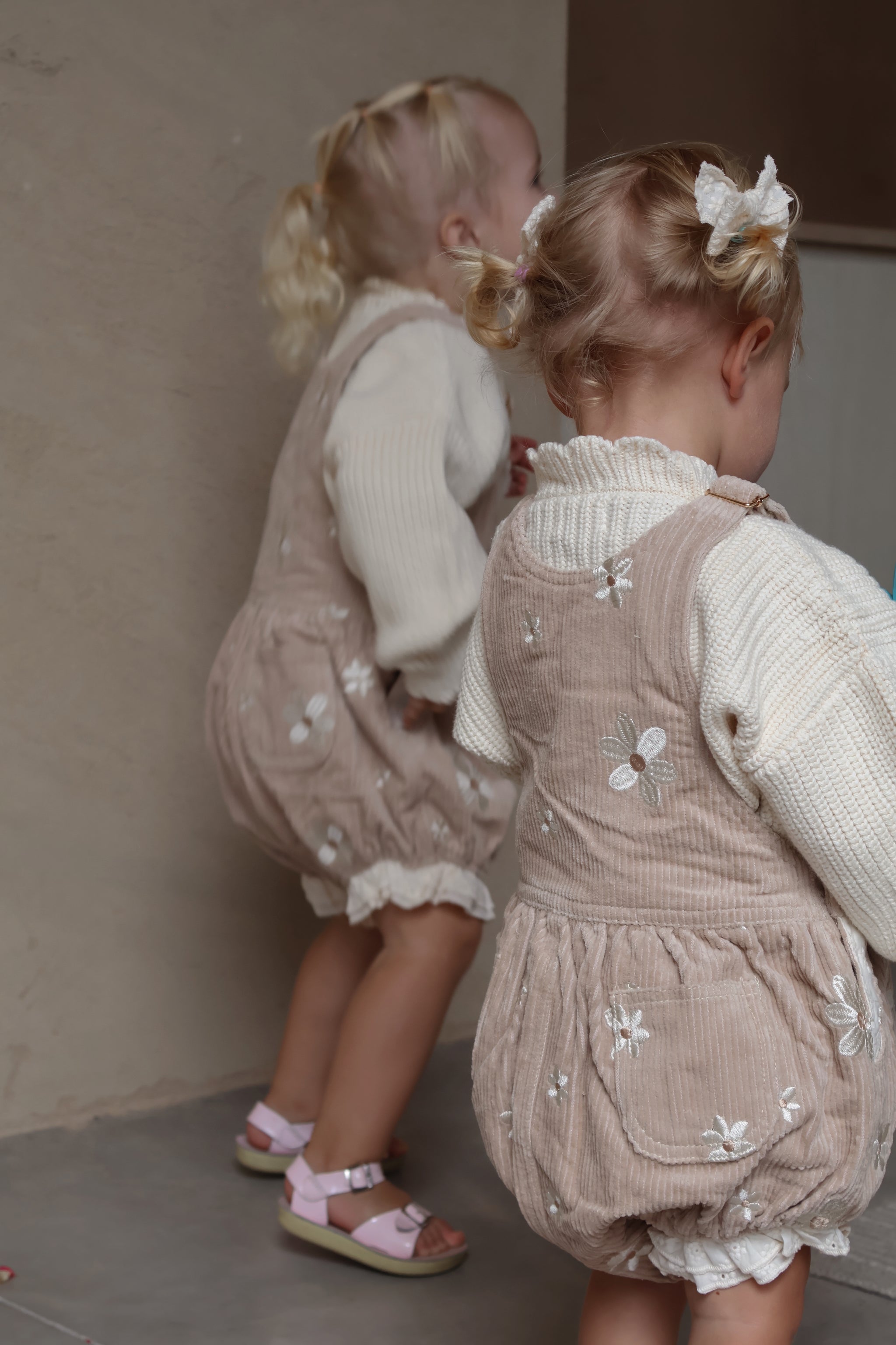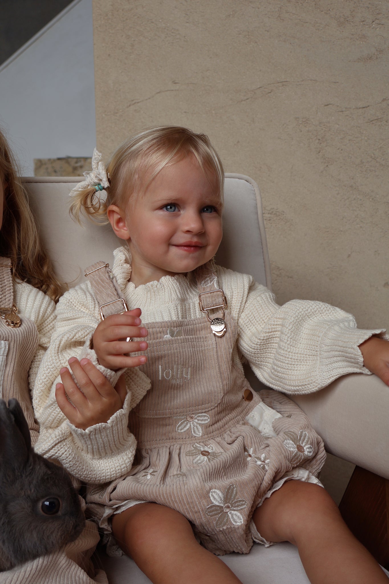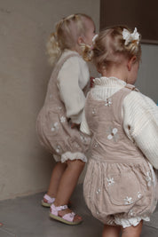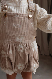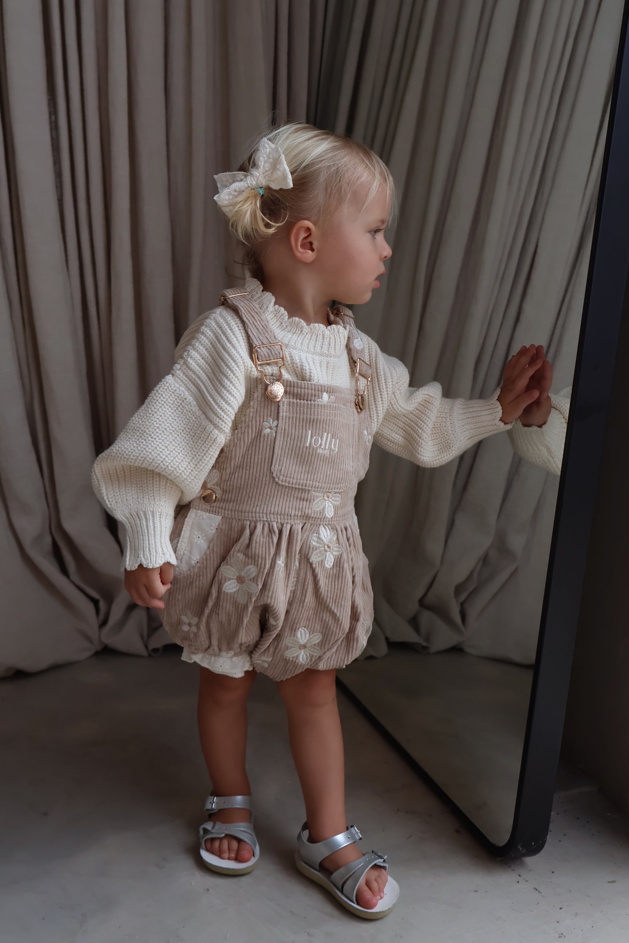 Our Signature Biscuit Bubble Overalls are made from the softest corduroy in a gorgeous biscuit brown. They feature custom cream embroidery daisy flowers throughout the body complimented by our highest quality custom gold coloured hardware. Pair with our matching Cream Daisy Lace crop or Coconut Puff Linen Crop.
