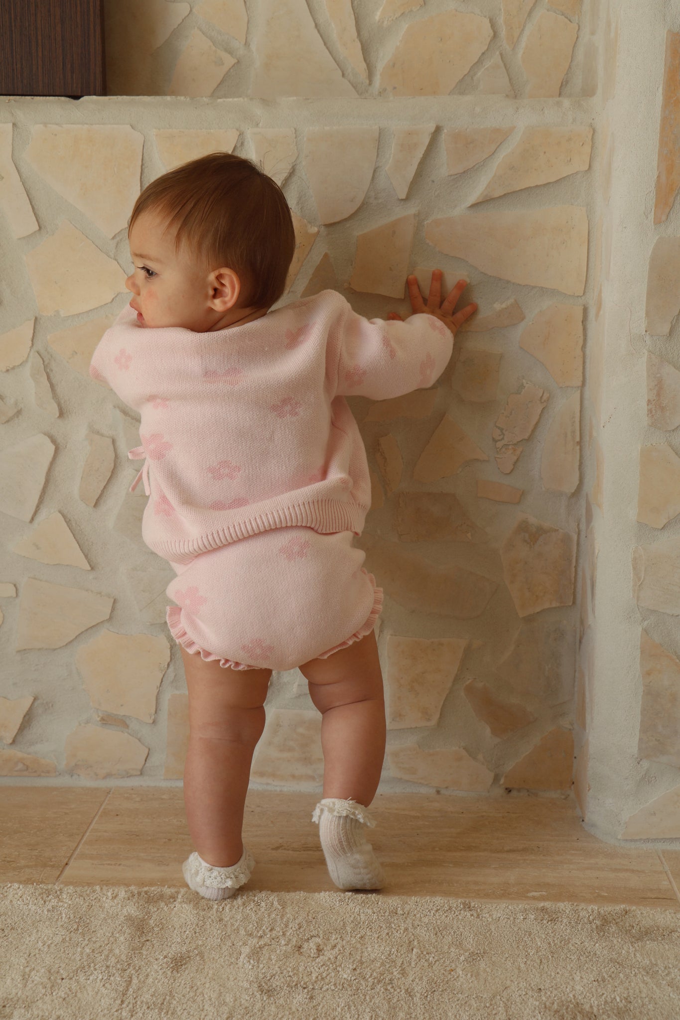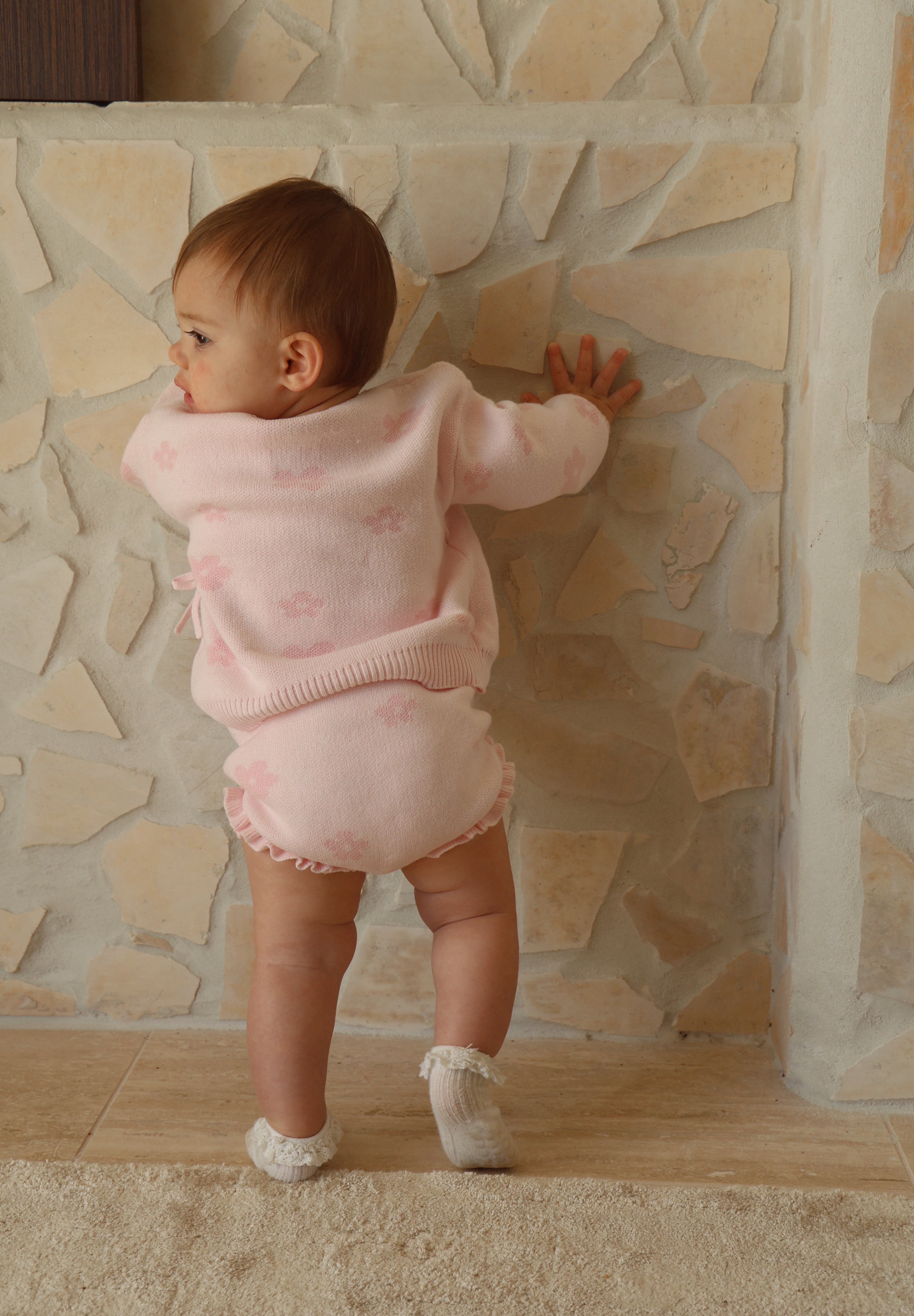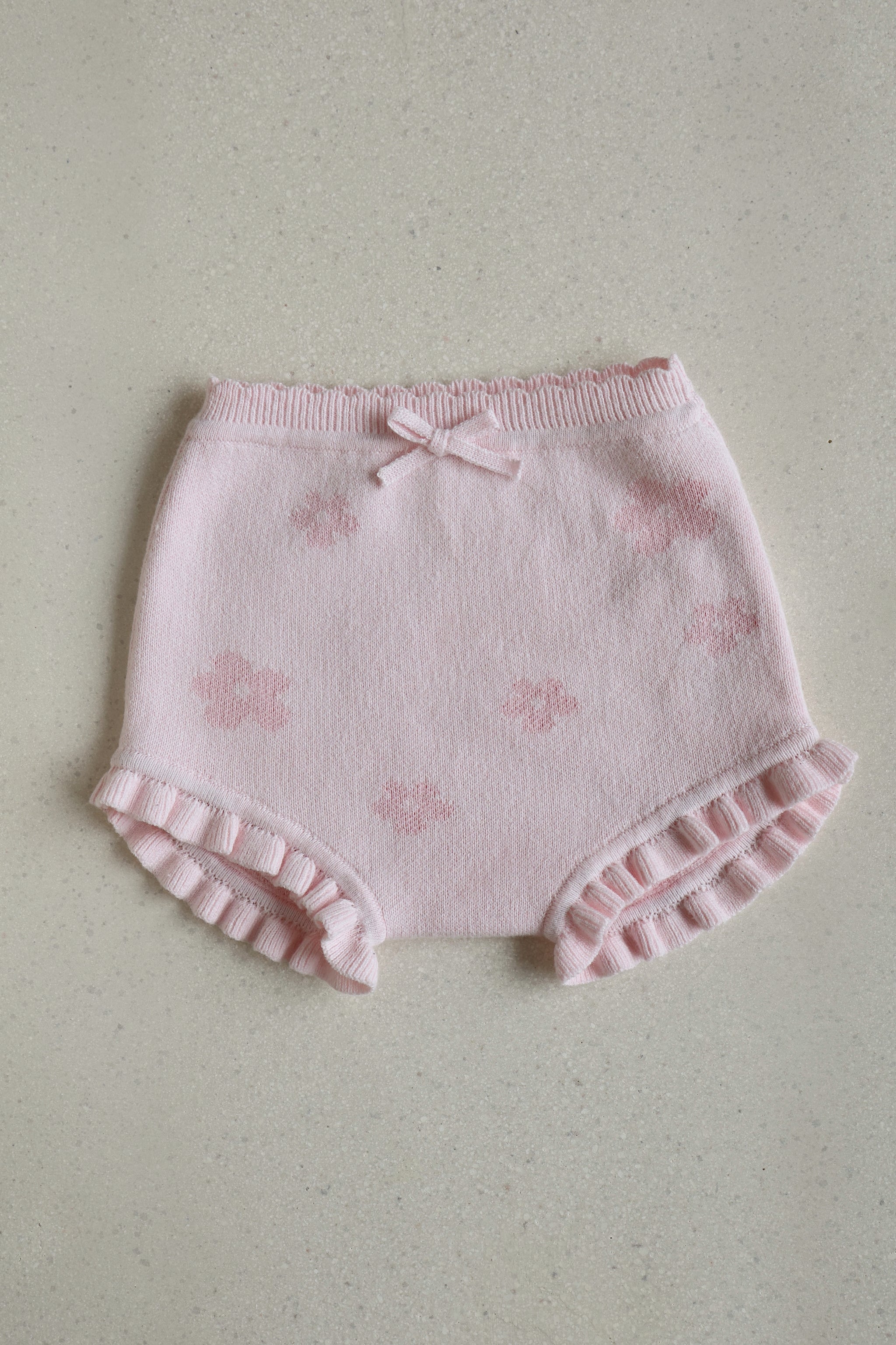 These knitted bloomers feature an all over floral design with delicate frill detail at the leg cuffs and a soft elasticated waistband for a comfy fit. Finished with a decorative knit bow for a charming final touch.