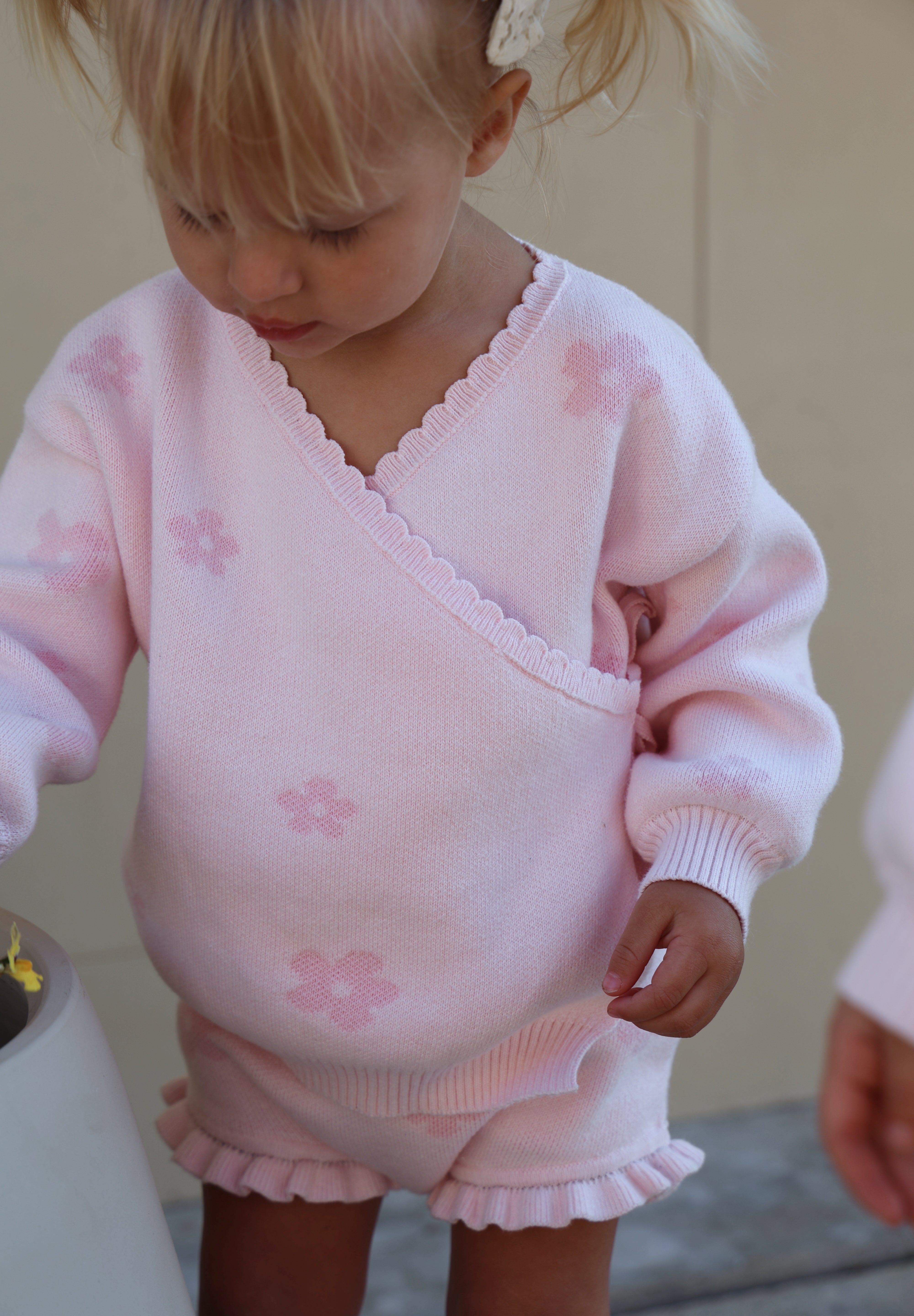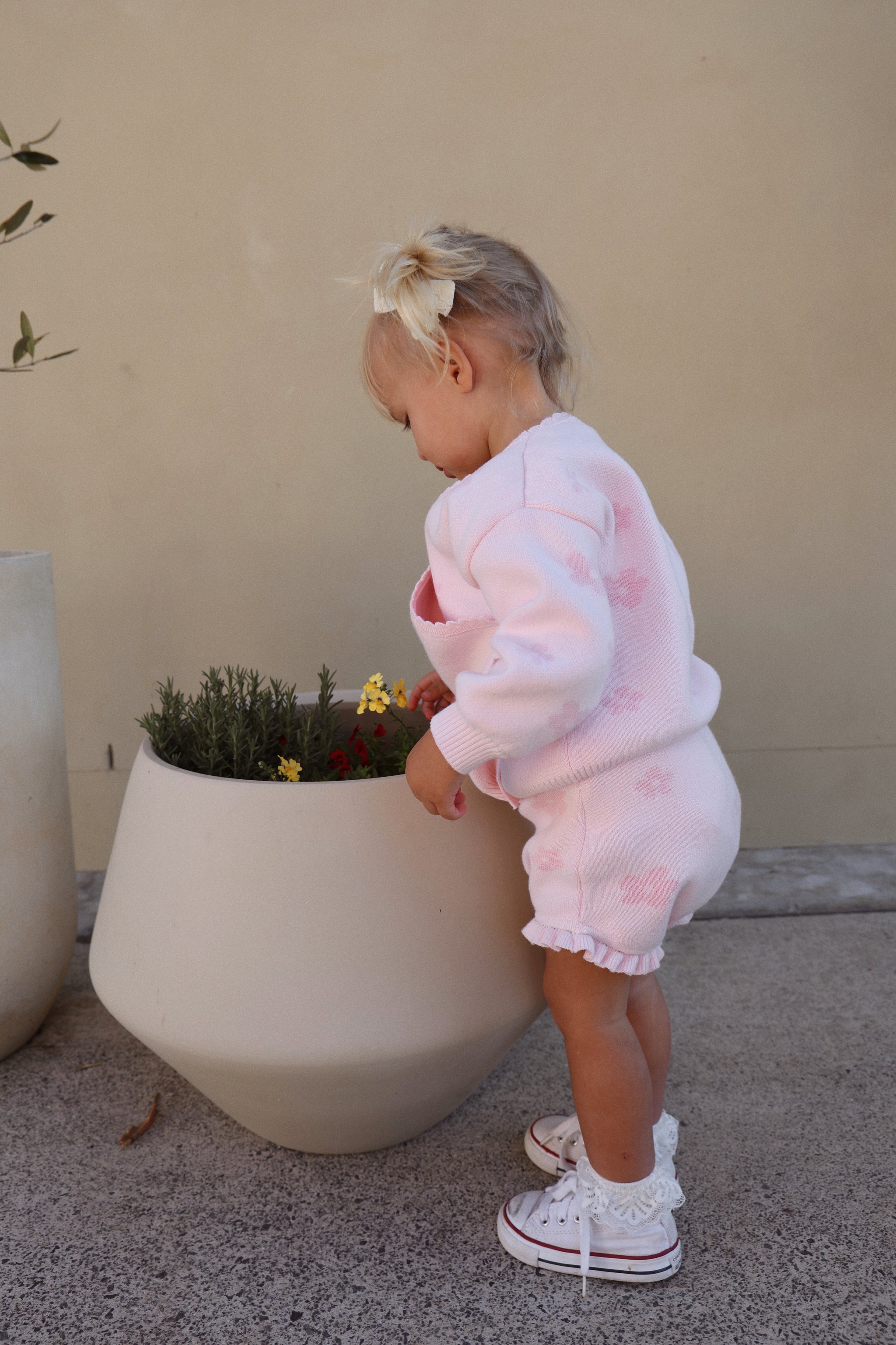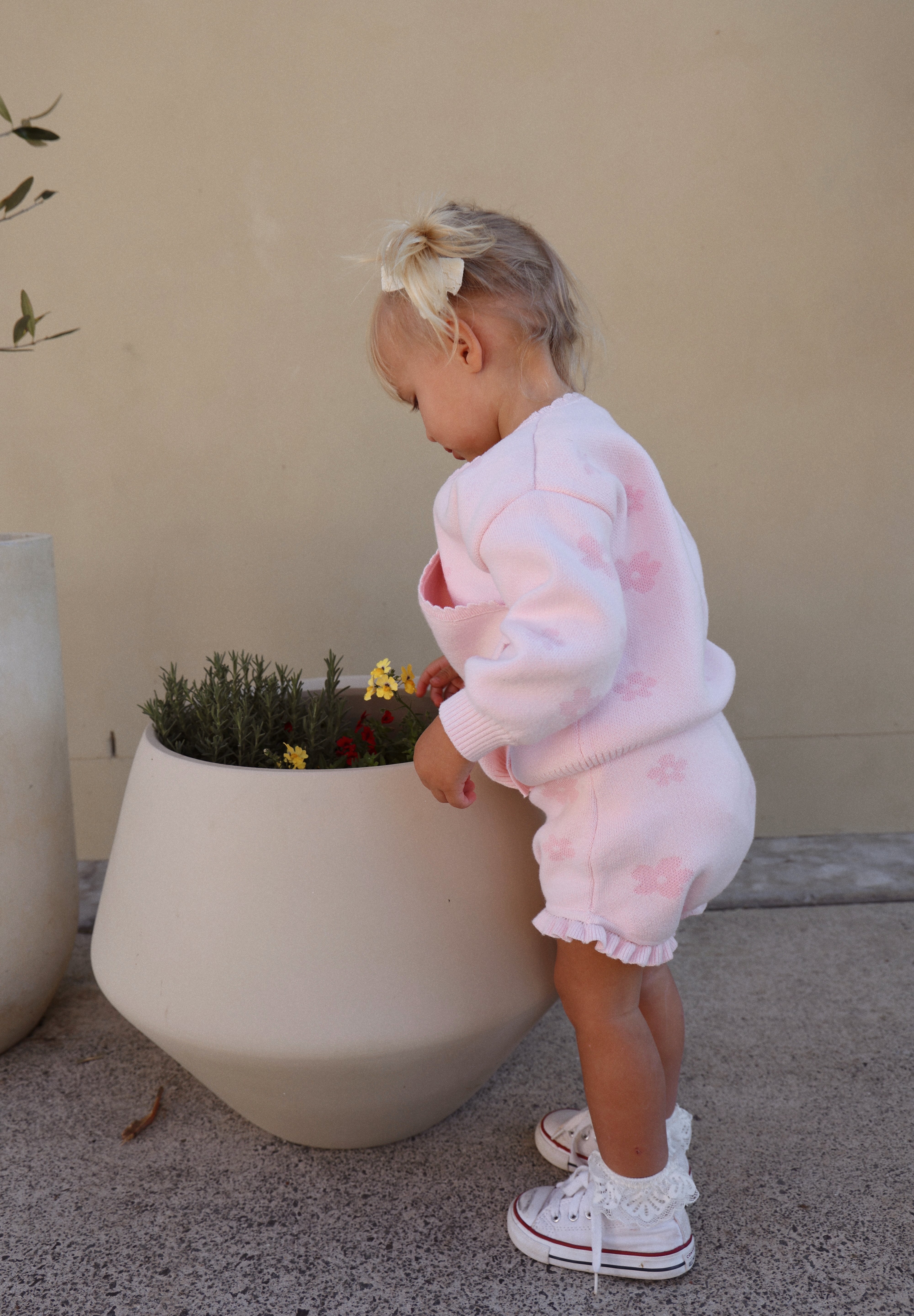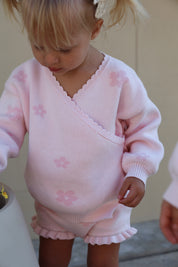 These knitted bloomers feature an all over floral design with delicate frill detail at the leg cuffs and a soft elasticated waistband for a comfy fit. Finished with a decorative knit bow for a charming final touch.