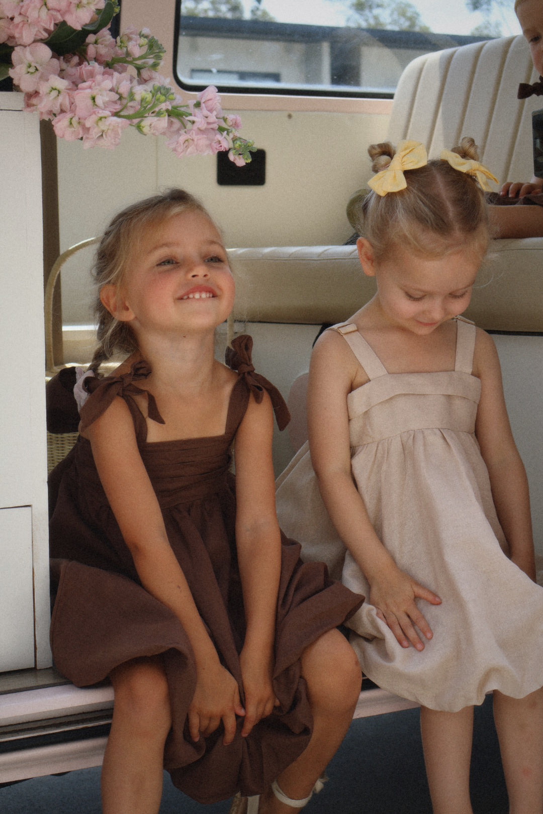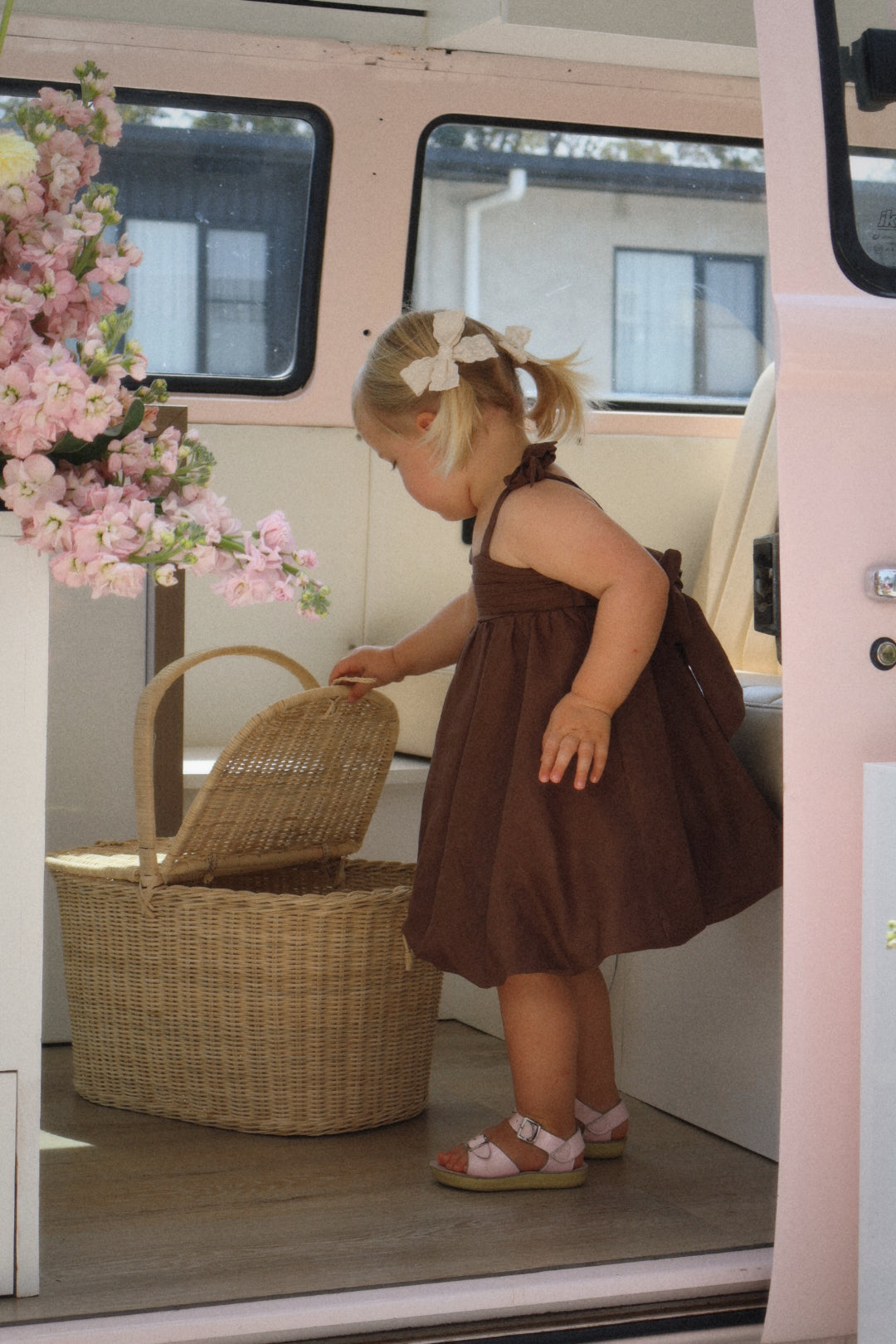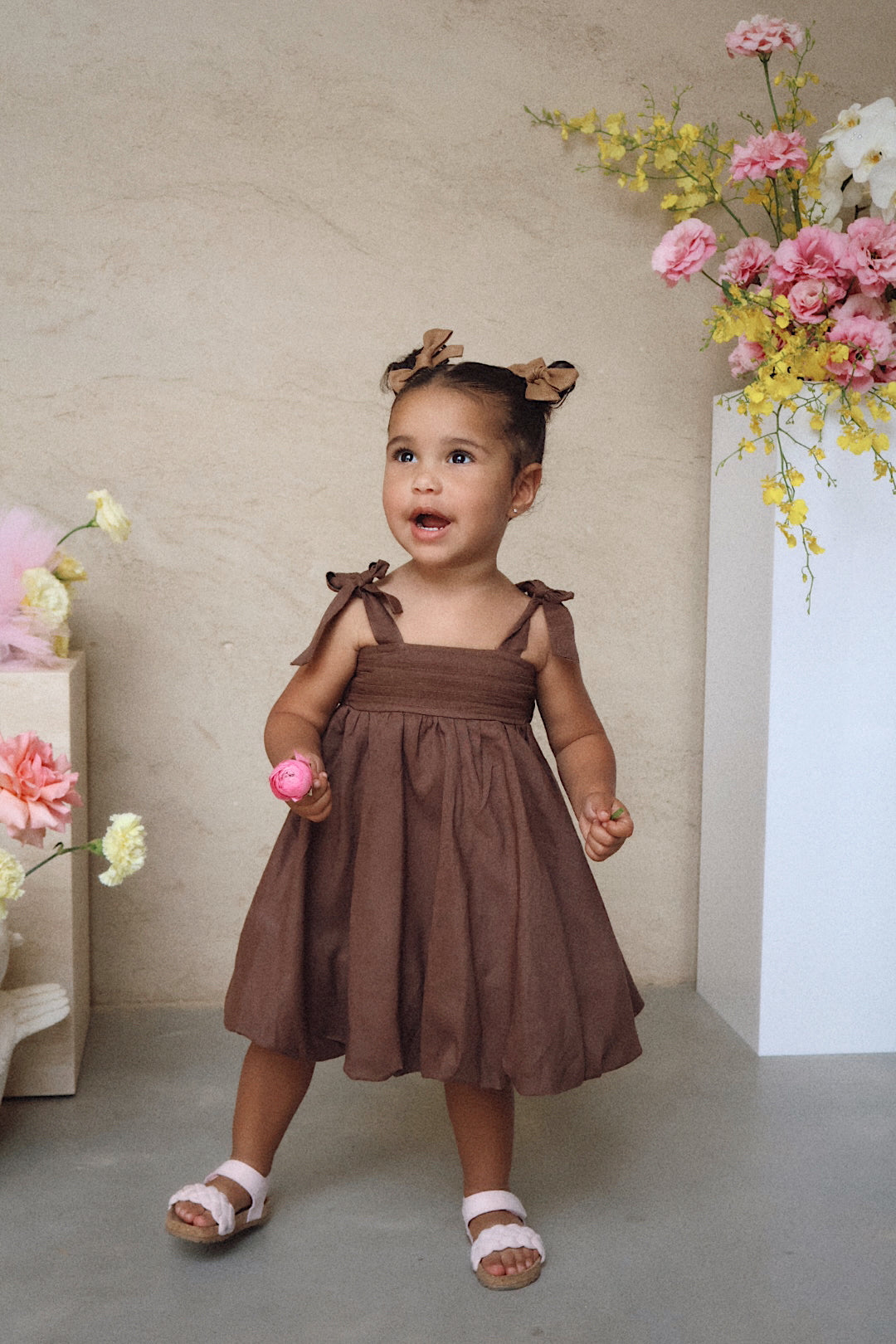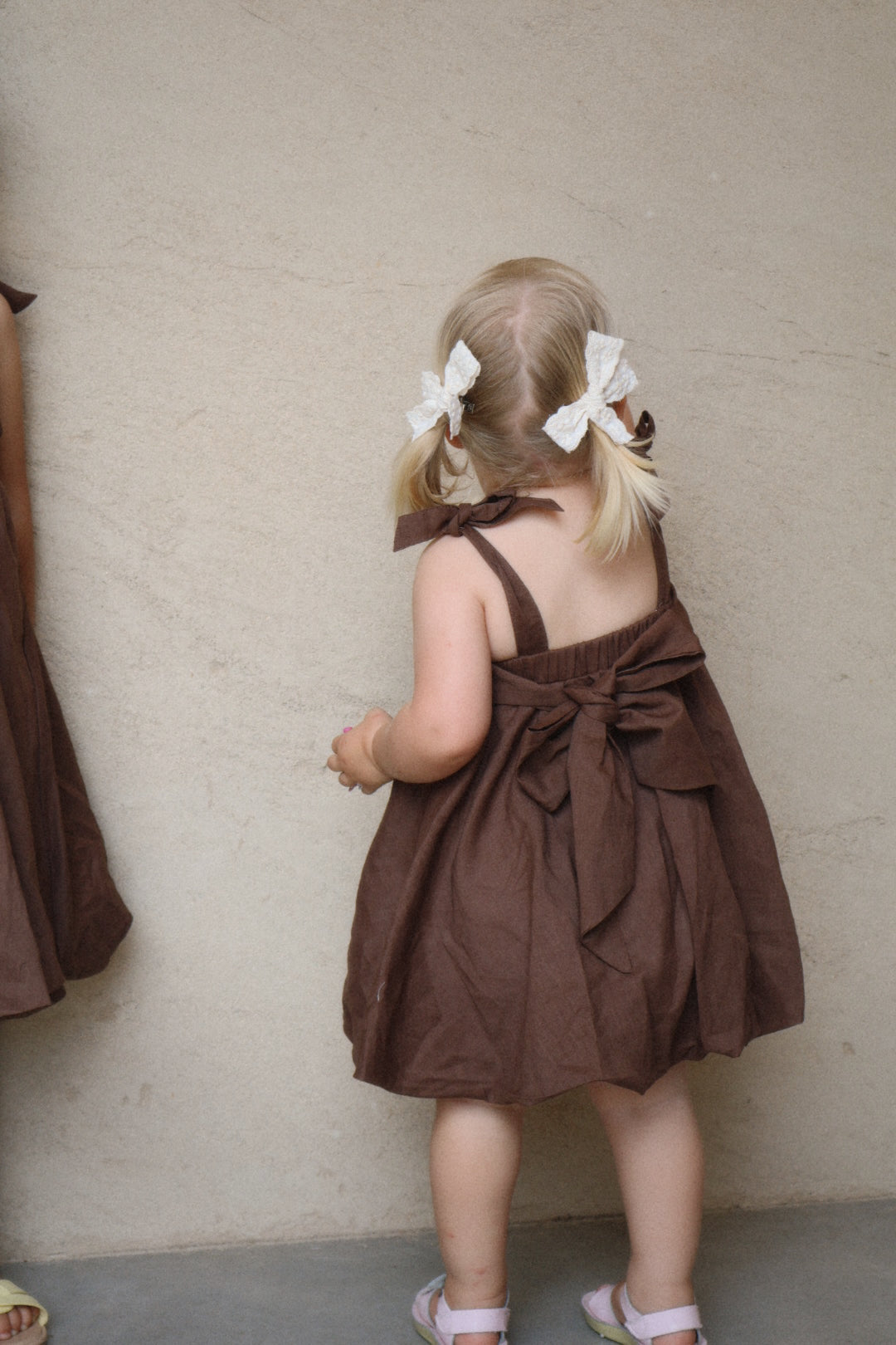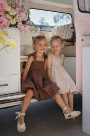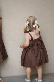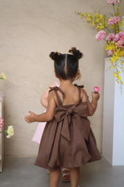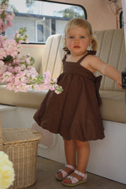Our gorgeous buttercup bubble dress is made from 100% soft linen with rayon lining in a beautiful cocoa hue. Showcasing horizontal pleating across the torso for a textured effect, elasticated waist at the back and a gorgeous big bow tie up detail, this is sure to have heads turning wherever you go. It’s both dainty and elegant in its design with a beautiful bubble hemline. This dress is perfect for every occasion and features adjustable tie up straps over the shoulders to compliment longevity of wear on your little darling.