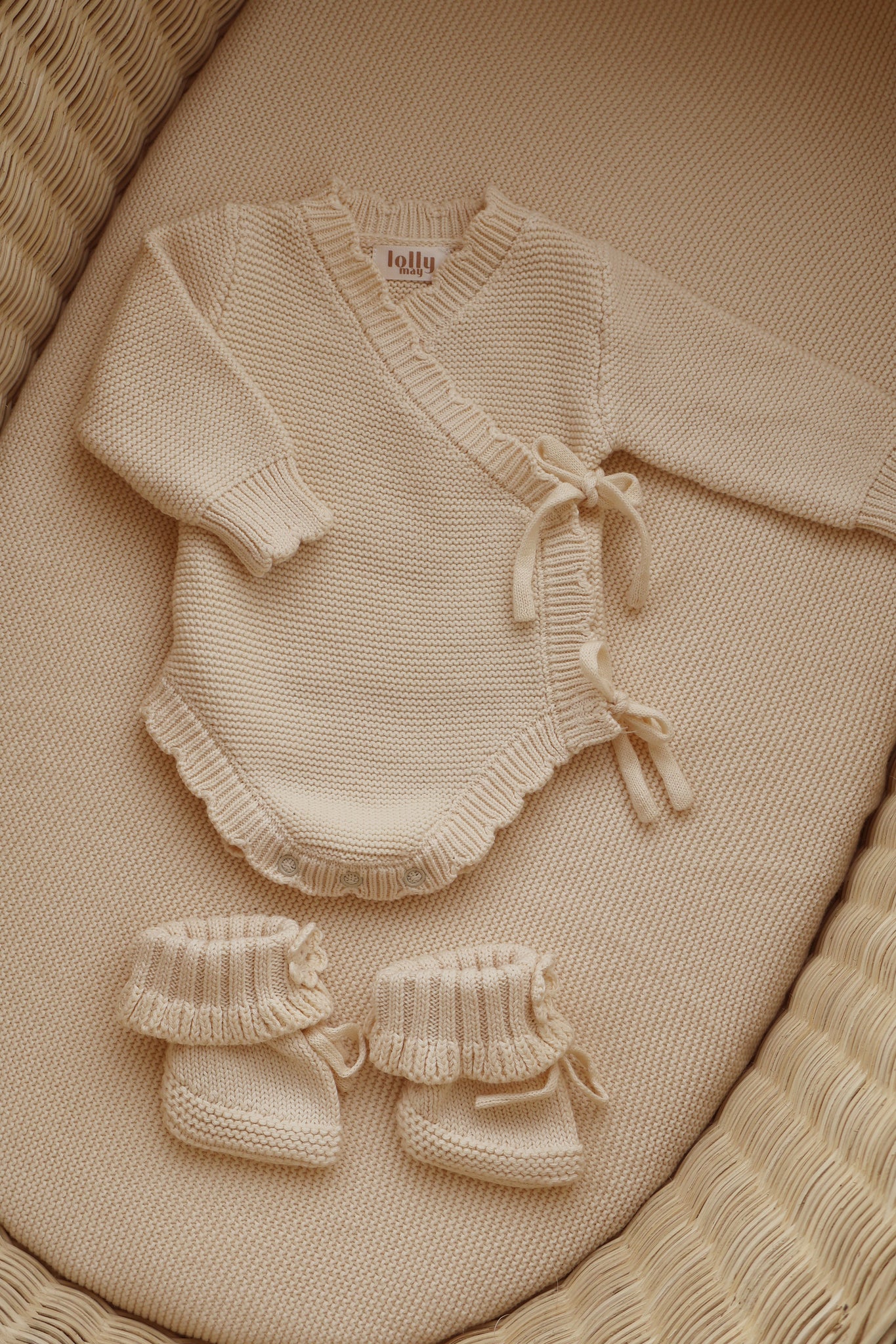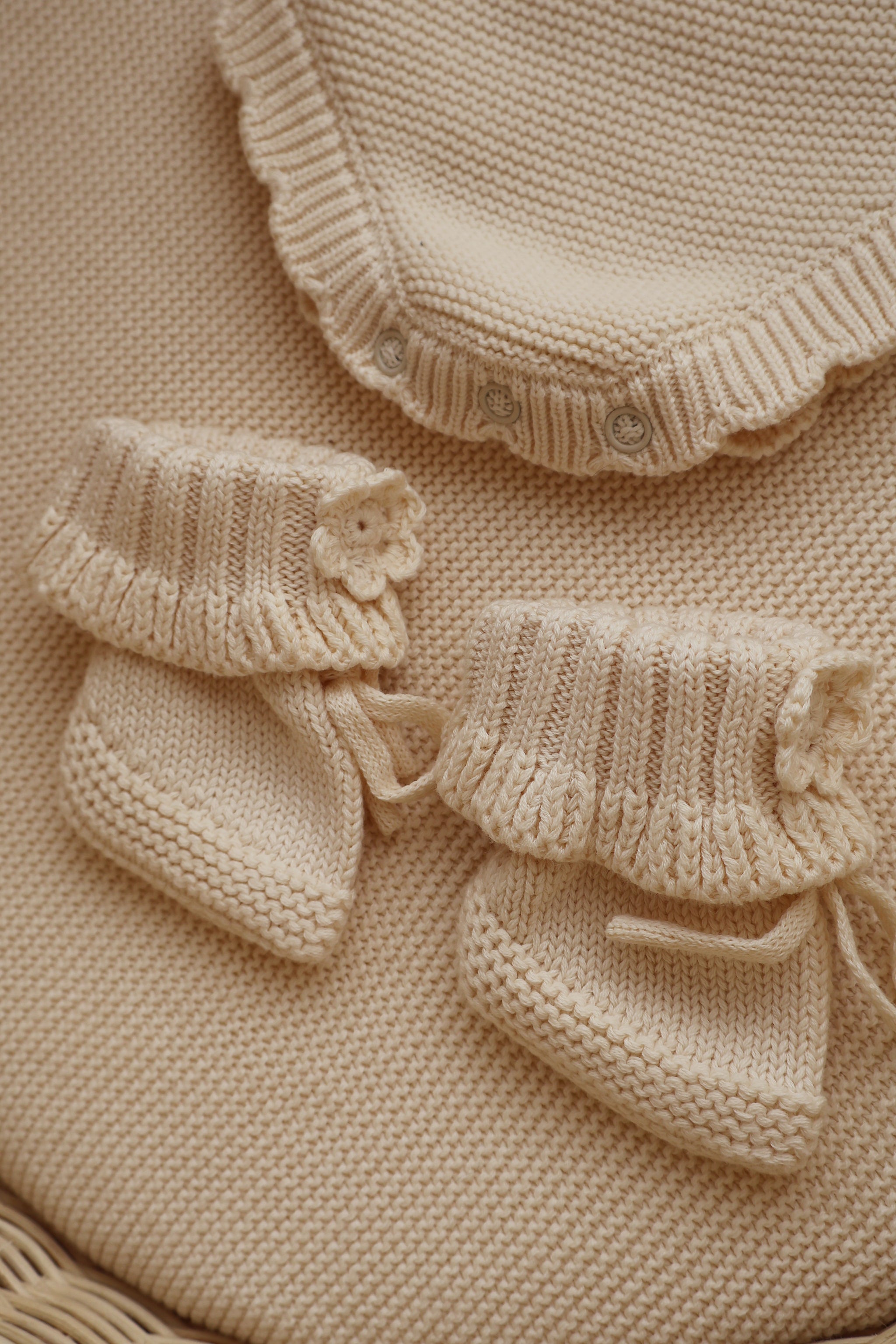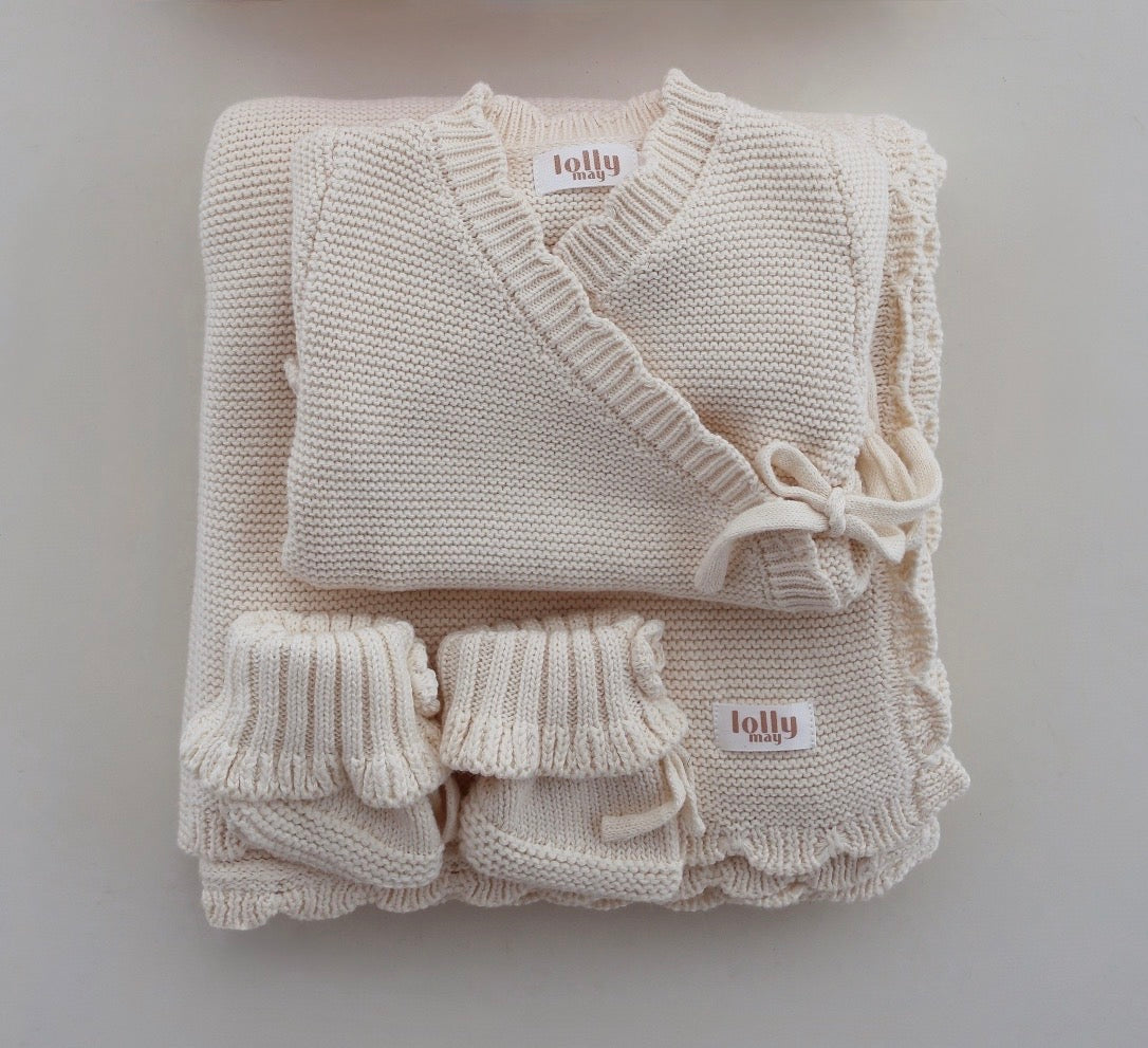 Paired perfectly with our handmade crochet booties and a matching scallop blanket, this bundle is the sweetest keepsake, created to be treasured for years to come and to hold those most precious first memories.