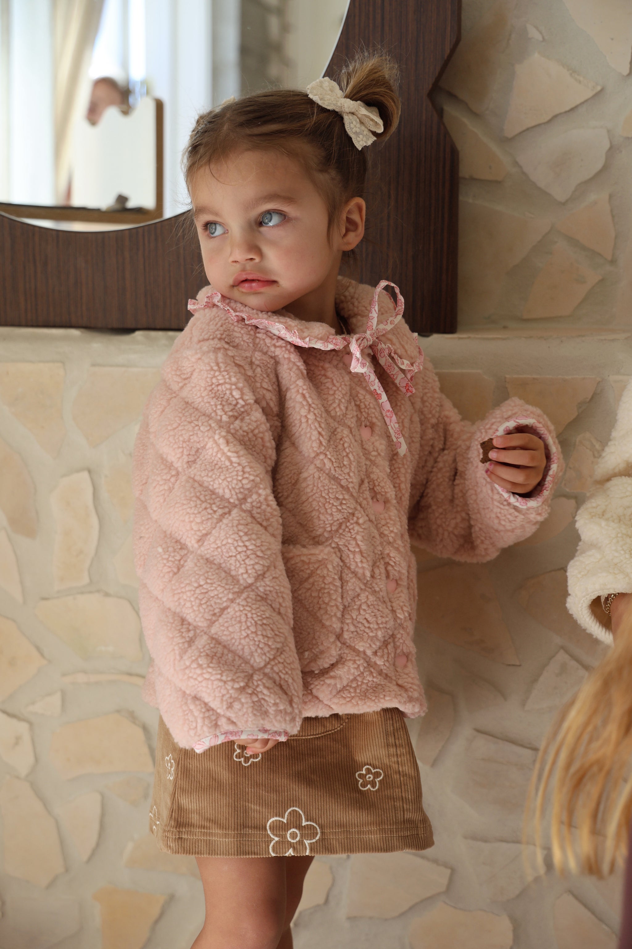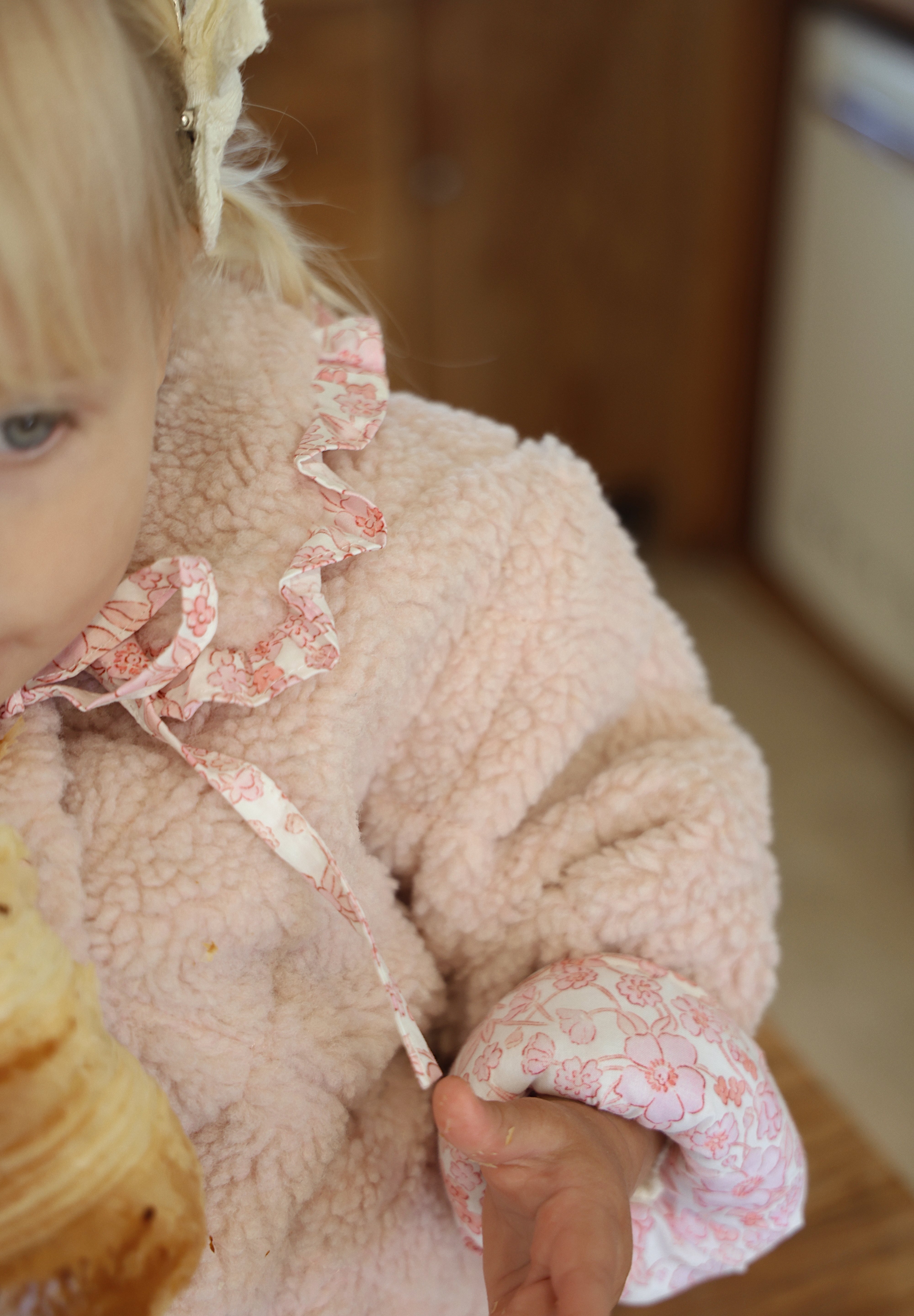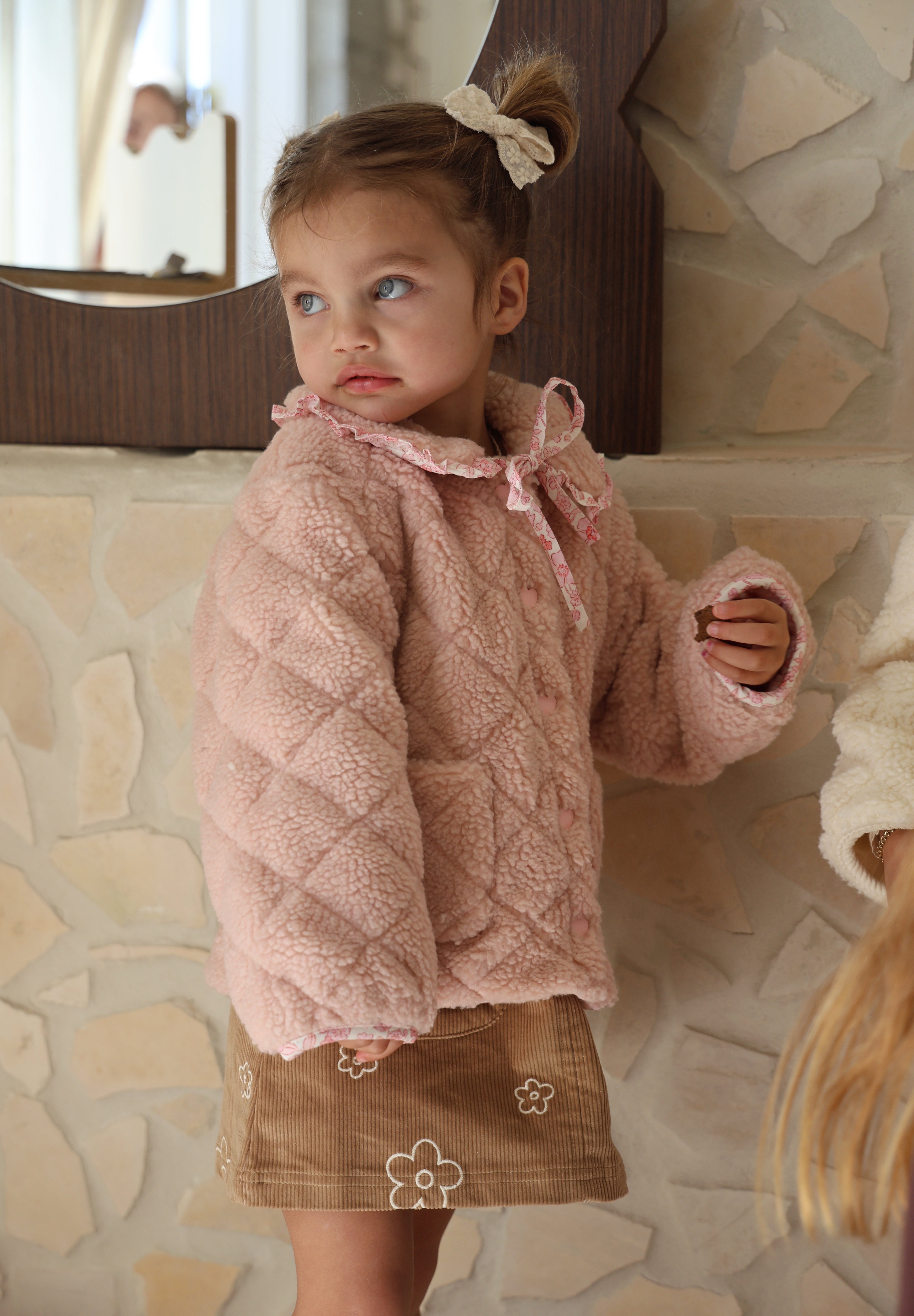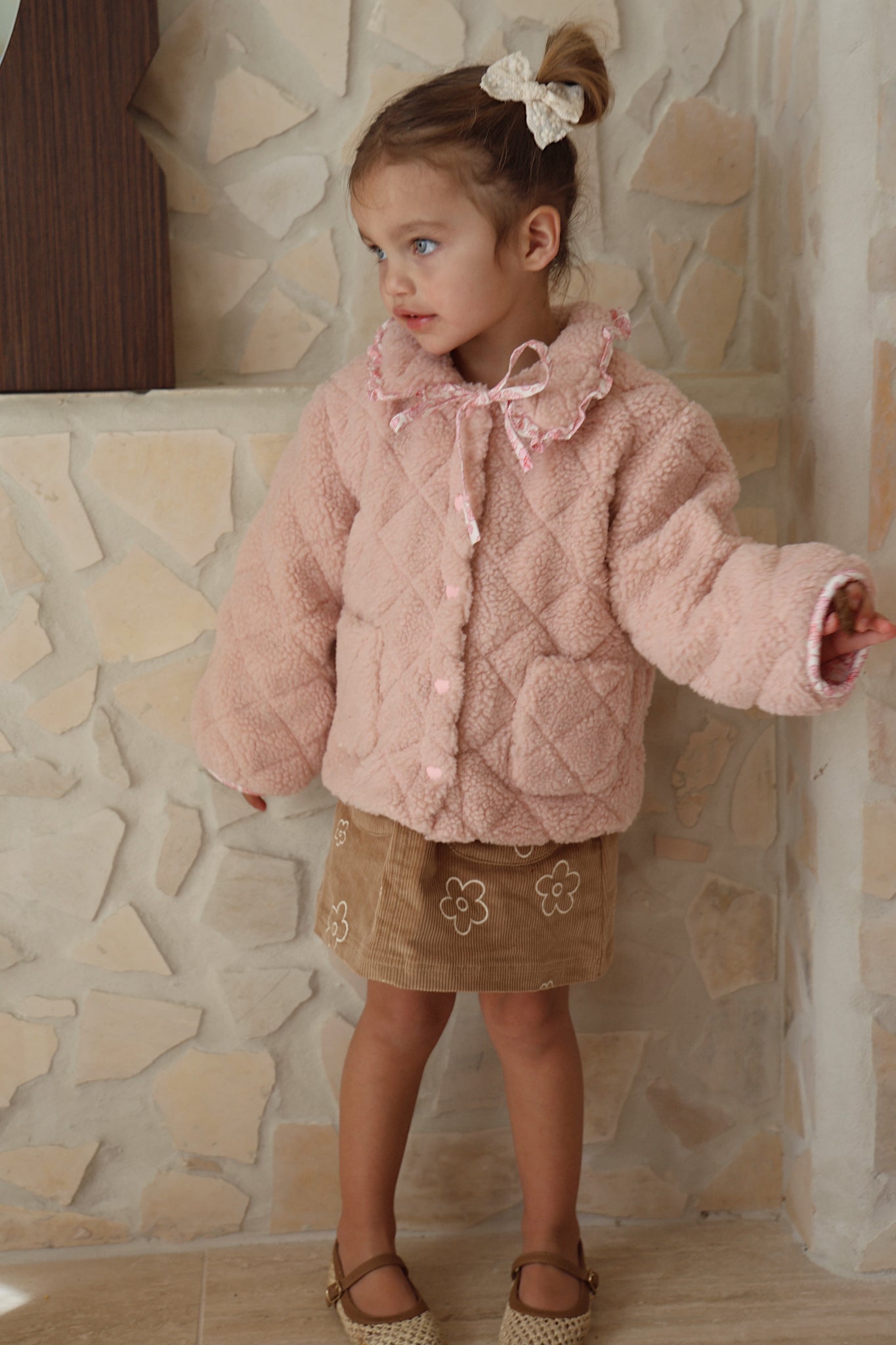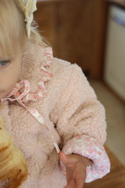 The Fairy Floss Sherpa Jacket is a warm hug on a chilly day. Made from plush teddy sherpa with a quilted finish, this jacket is lined in our exclusive fairy floss print. Soft cotton sweetness on the inside, cosy comfort on the outside. It features custom heart-shaped snap buttons for easy wear, two pockets on the front for tiny treasures, and a storybook collar you won’t find anywhere else.