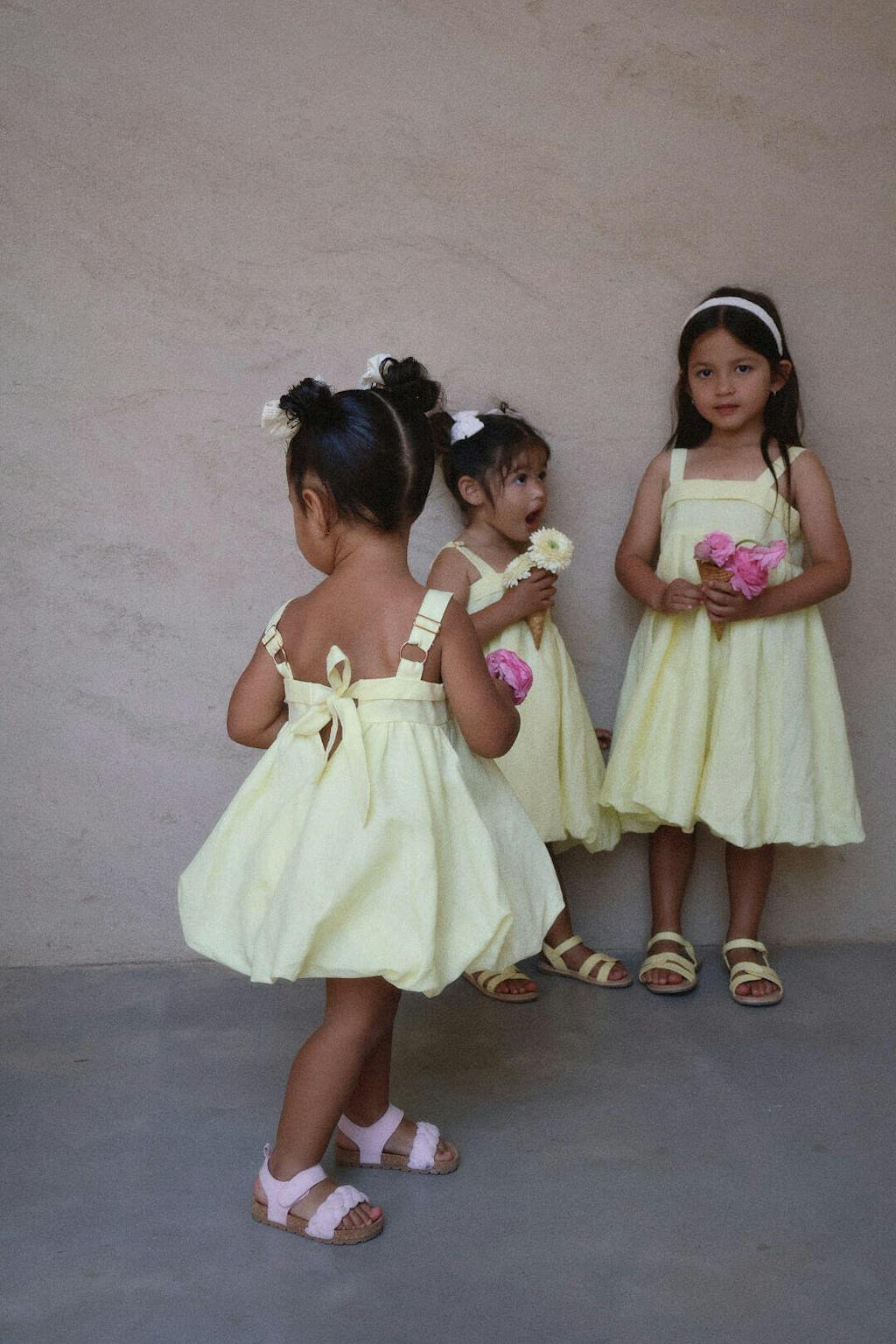 Our gorgeous lemon baby doll dress is made from 100% soft linen in a beautiful pastel lemon colour. Showcasing a mini bubble skirt, fixed waist and cut out detailing at the back with a gorgeous tie up bow. Its both dainty and elegant in its design. This dress is perfect for every occasion and features high quality gold coloured hardware which makes the straps adjustable to compliment longevity of wear.