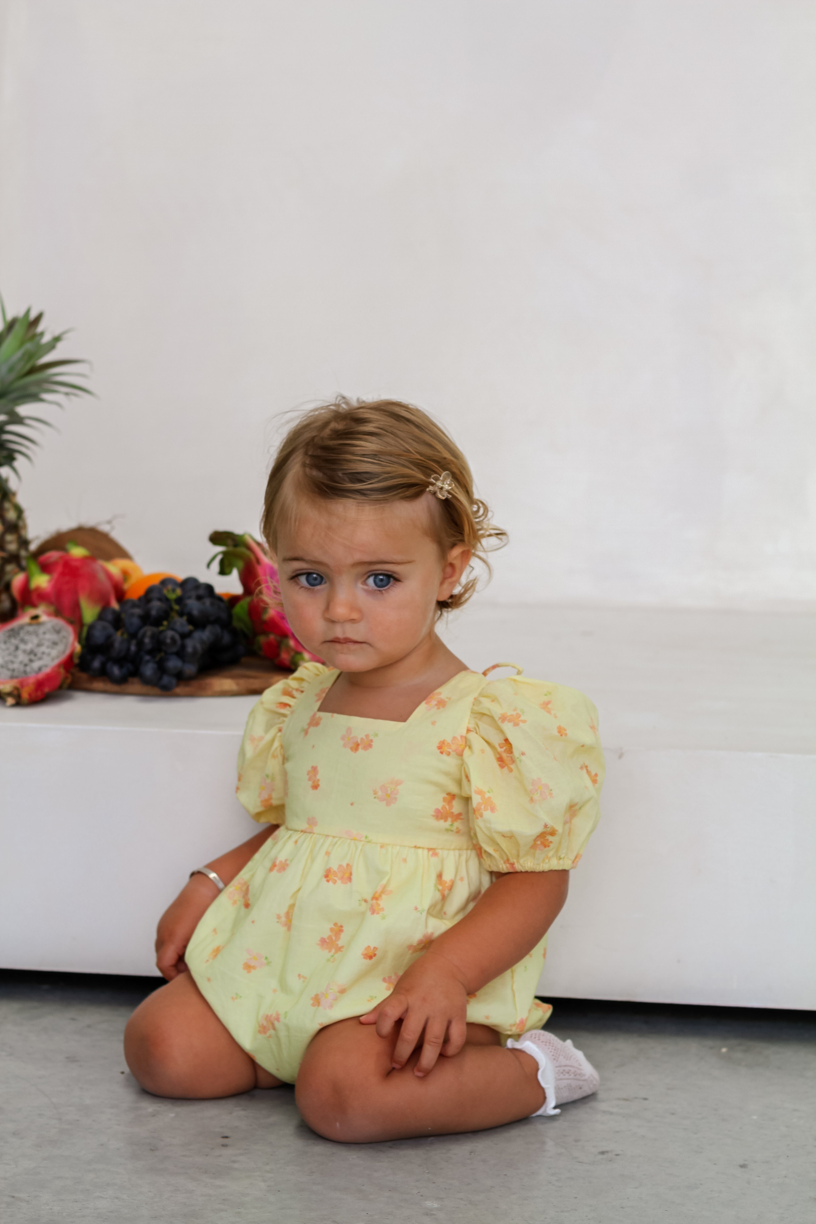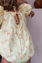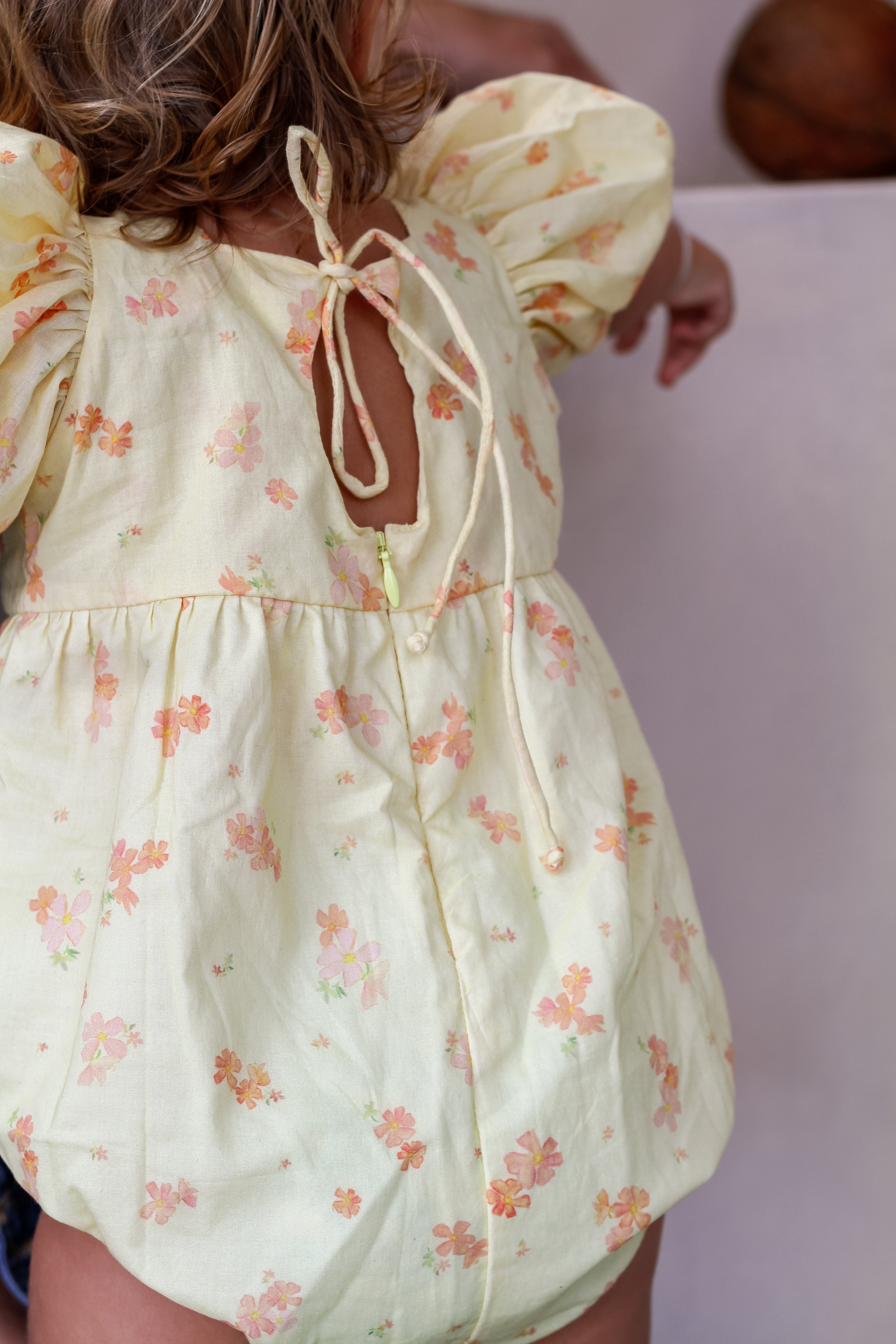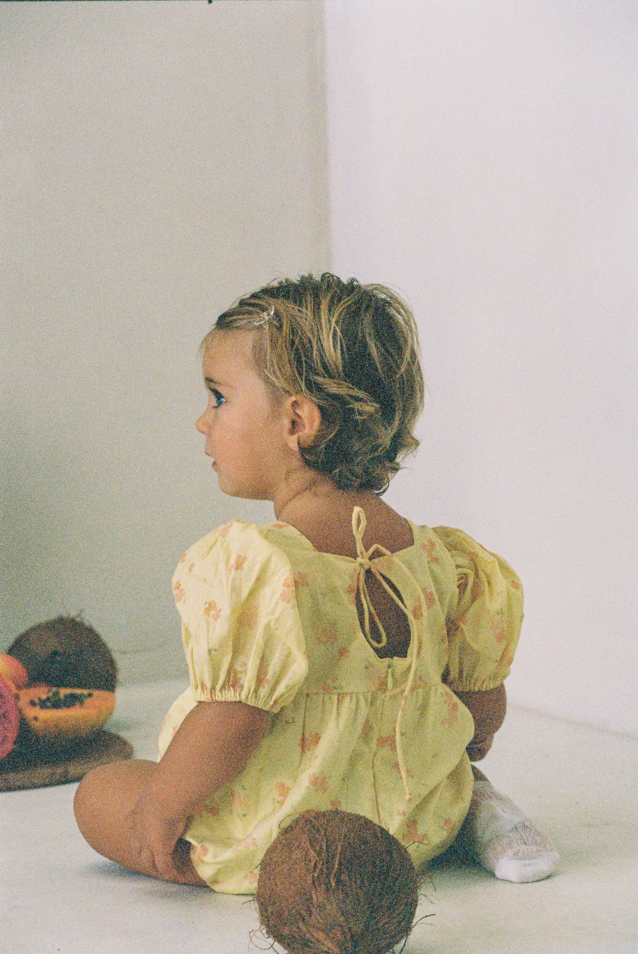 Our beautiful open back Puff Romper in our exclusive hand painted Tropical floral print is designed to be lightweight and airy for your little ones to wear. Its made from the softest organic cotton and is double lined. It features the most delicate details including the puffy sleeves and relaxed elasticated leg holes and arm openings. It has beautiful back detailing including a small key hole with dainty straps to be tied into a bow. We have designed this with comfort in mind so have added an invisible zip for easy access.