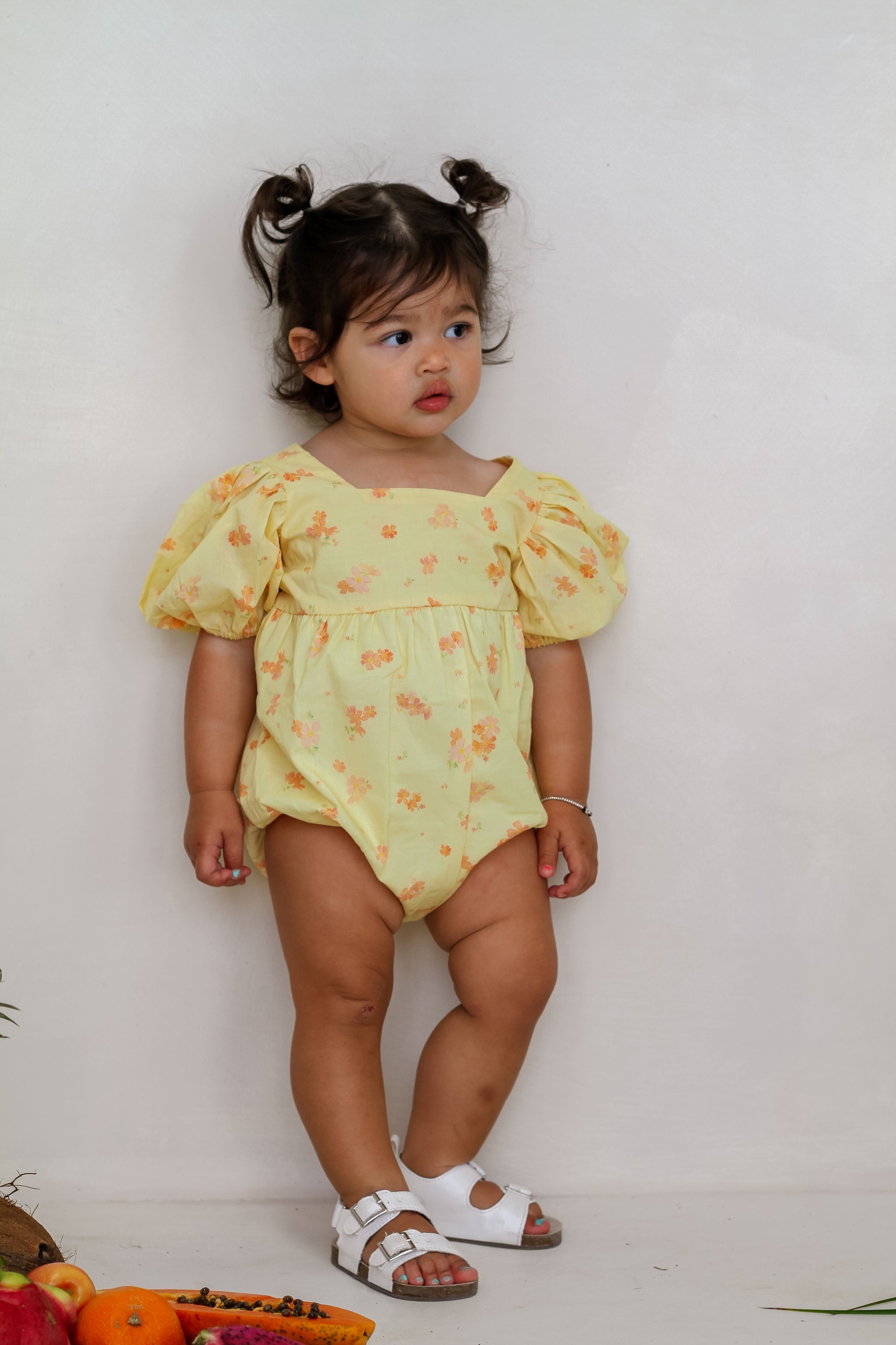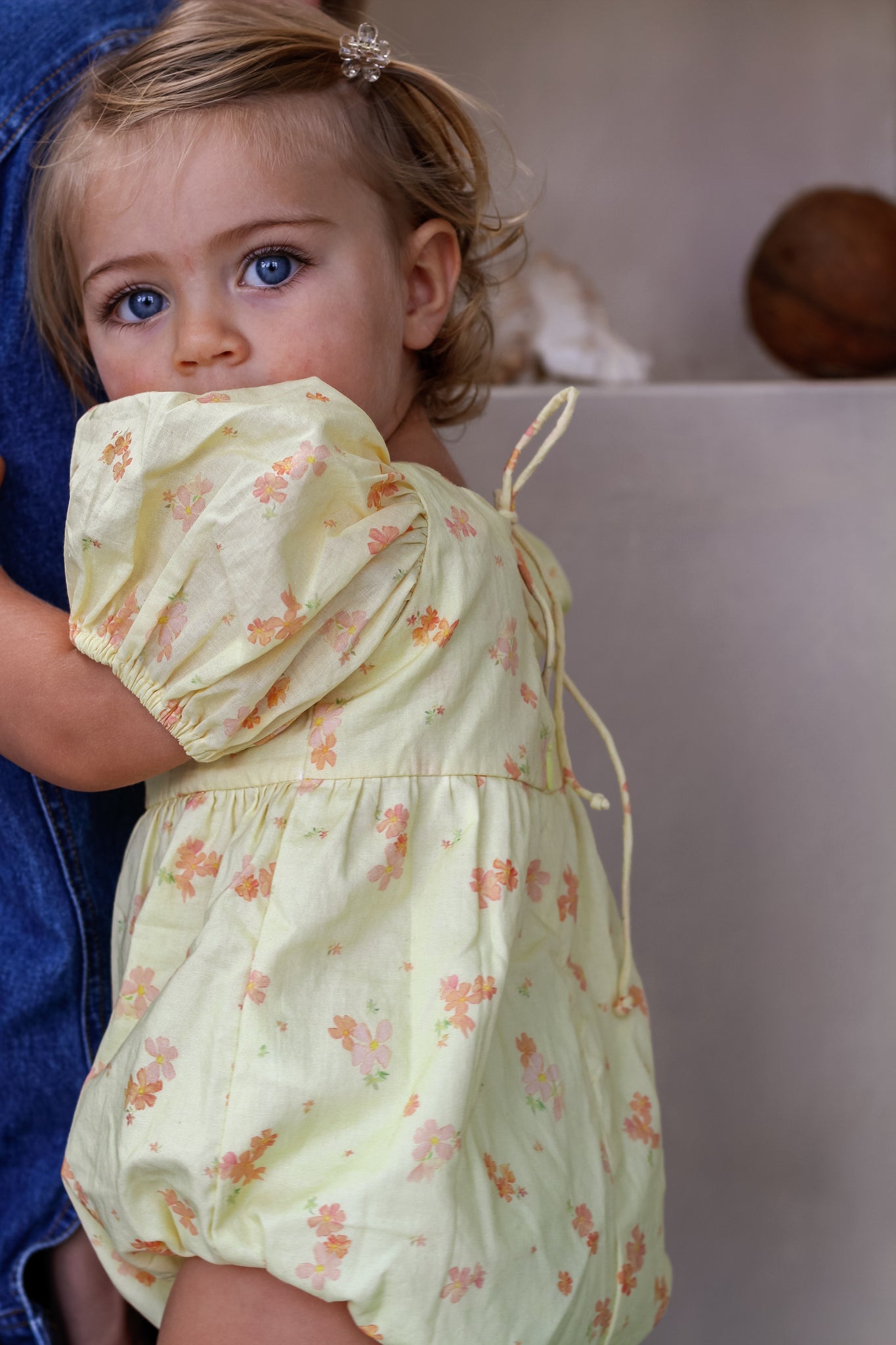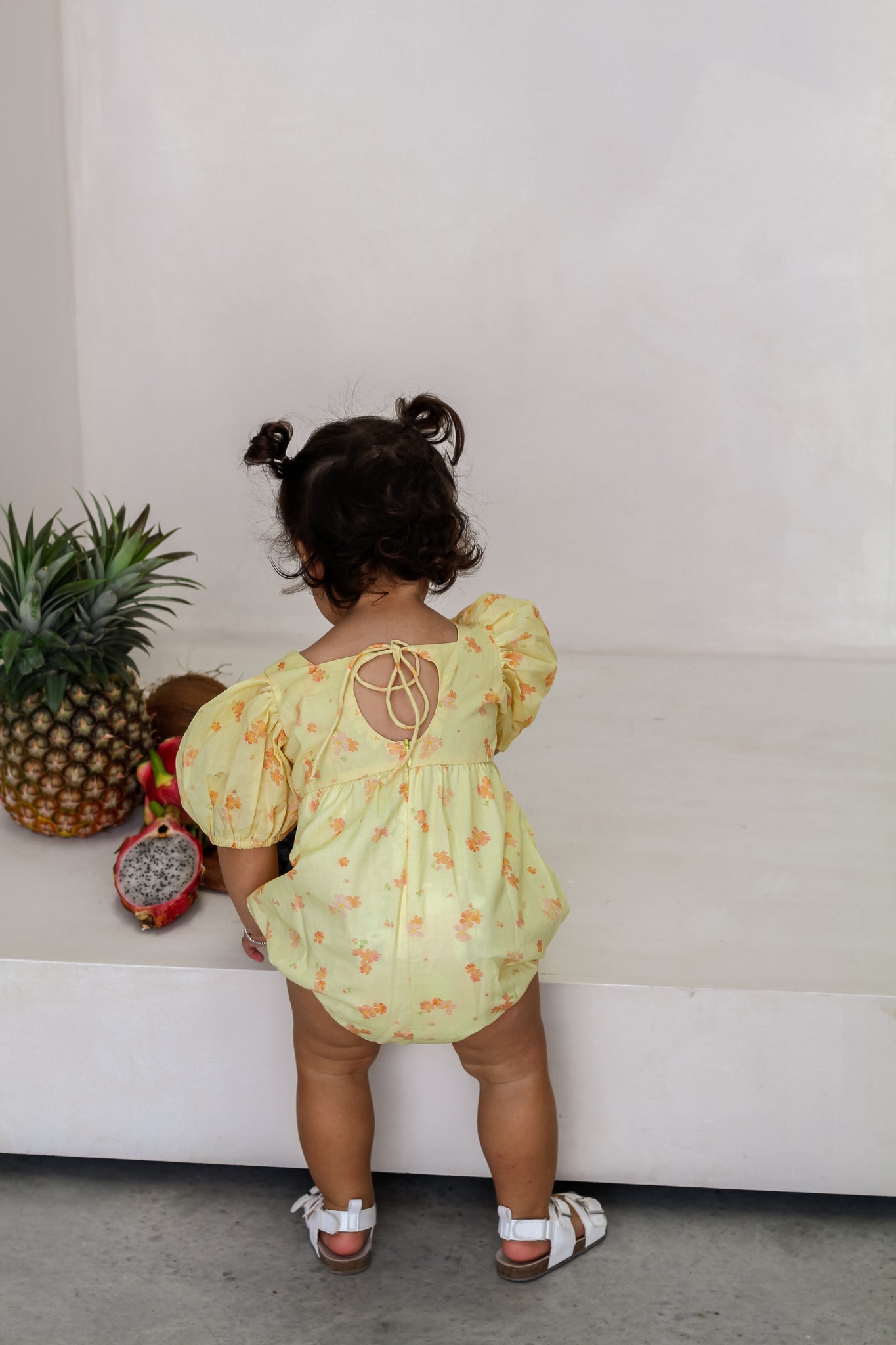 Our beautiful open back Puff Romper in our exclusive hand painted Tropical floral print is designed to be lightweight and airy for your little ones to wear. Its made from the softest organic cotton and is double lined. It features the most delicate details including the puffy sleeves and relaxed elasticated leg holes and arm openings. It has beautiful back detailing including a small key hole with dainty straps to be tied into a bow. We have designed this with comfort in mind so have added an invisible zip for easy access.