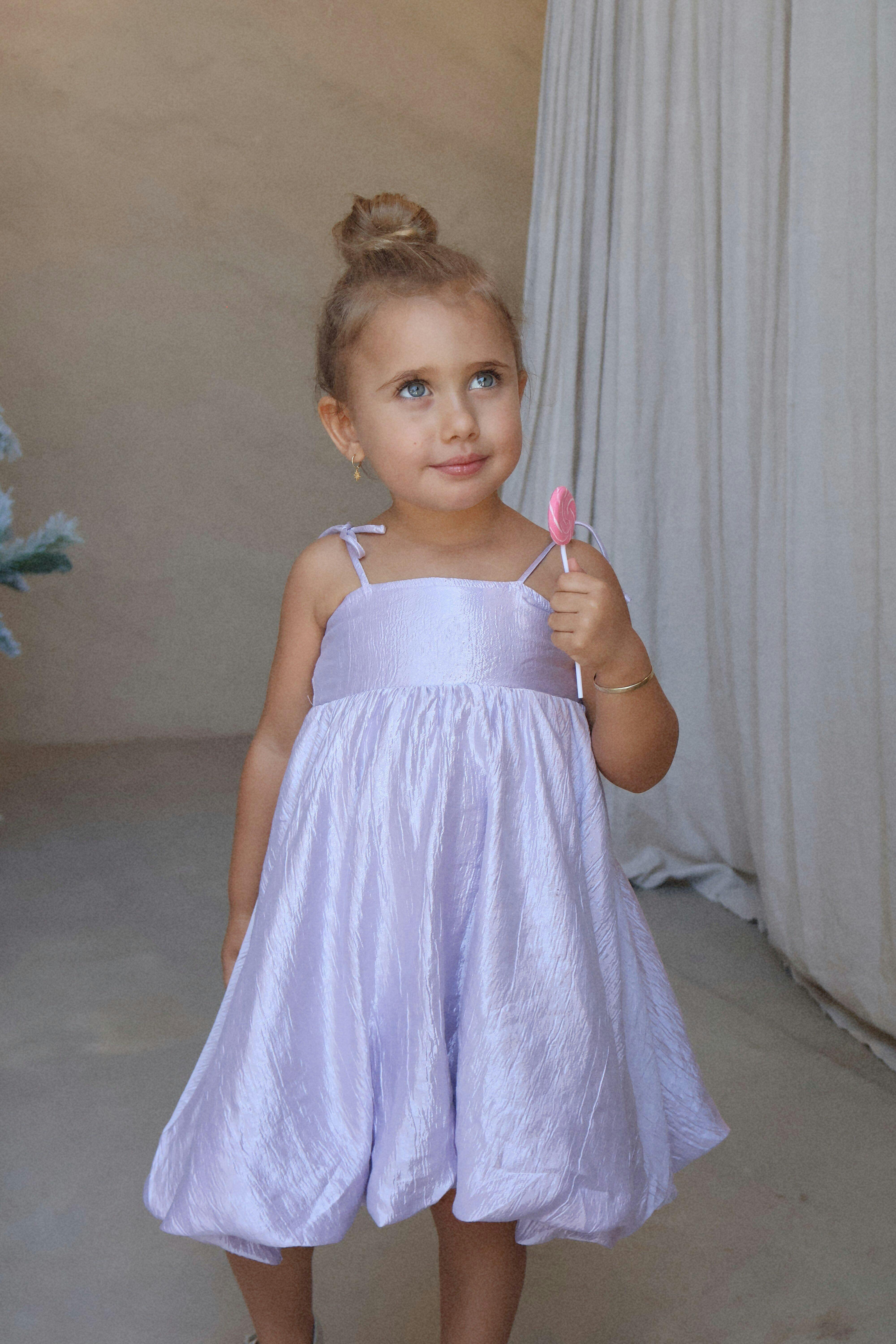 Our gorgeous Passionfruit bubble dress is crafted from 100% organza sheer fabric in a stunning Lilac hue and is double lined with soft cotton, giving it a delicate, ethereal quality. The soft, shimmering texture of the organza adds a luxurious touch, creating a graceful, airy feel that's perfect for the holiday season. Showcasing a beautiful oversized bow tie-up detail, this dress is sure to turn heads wherever you go. It’s both dainty and elegant in its design with a beautiful bubble hemline it’s the perfect Christmas dress. This dress also features adjustable tie up straps over the shoulders to compliment longevity of wear on your little darling.