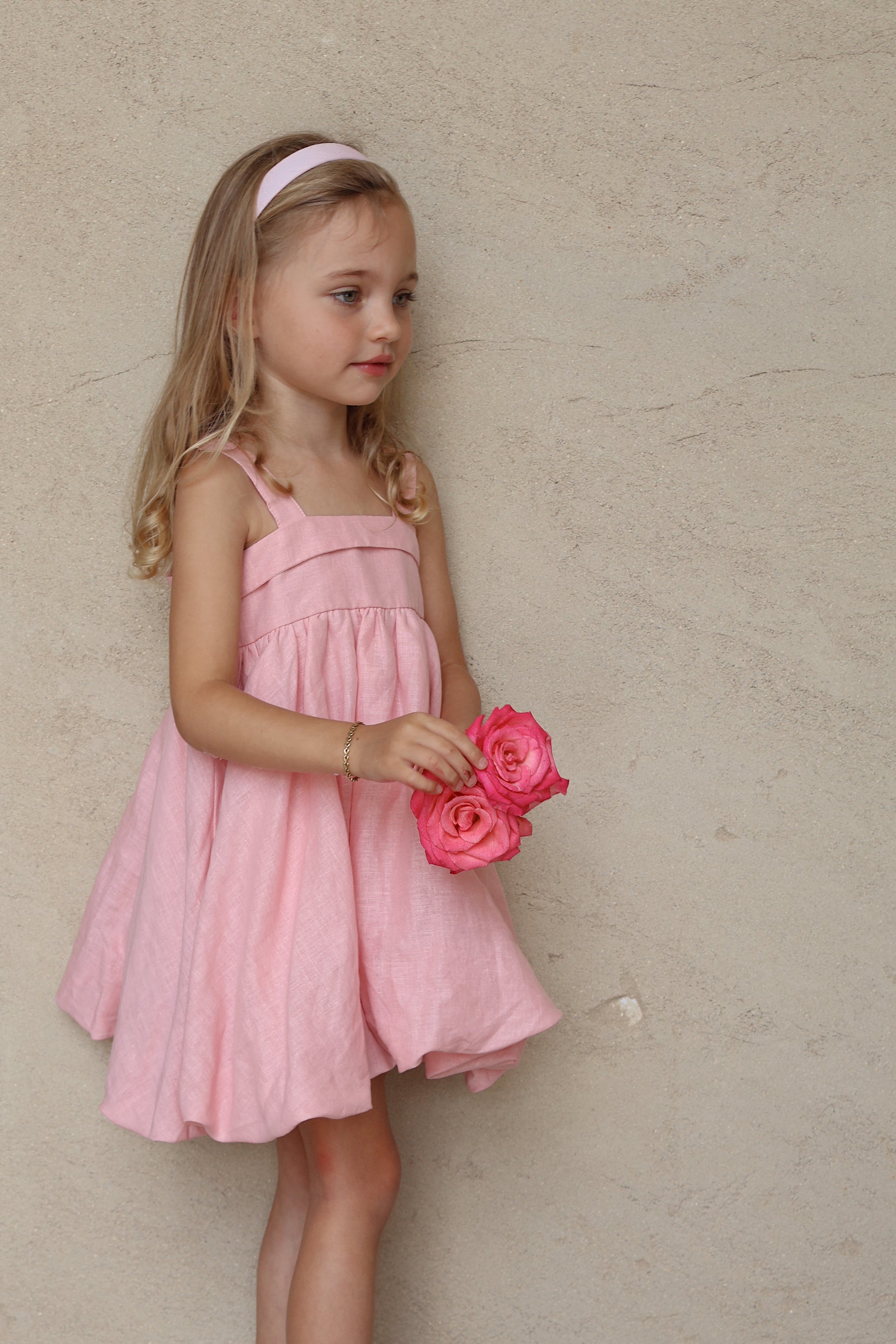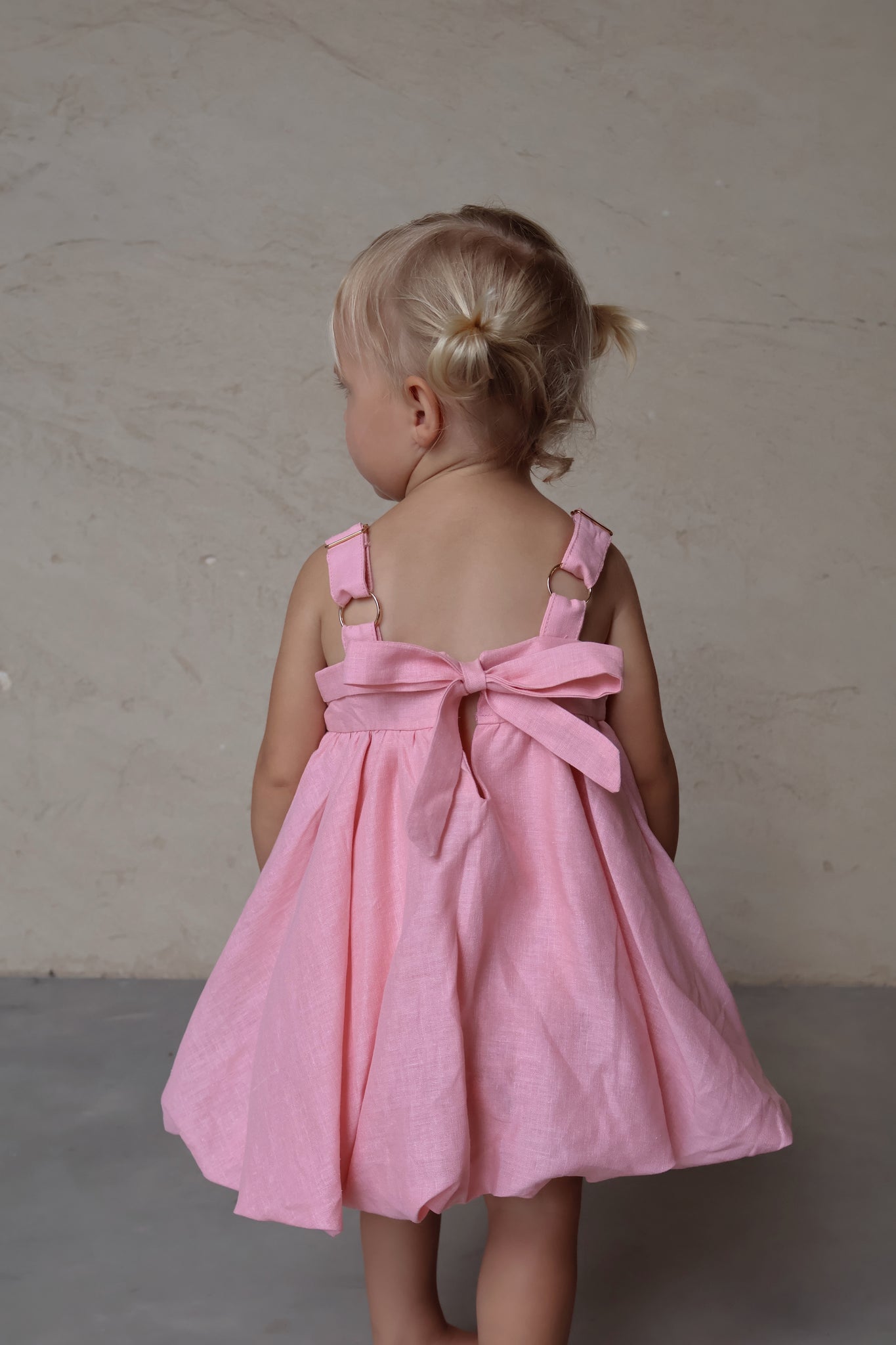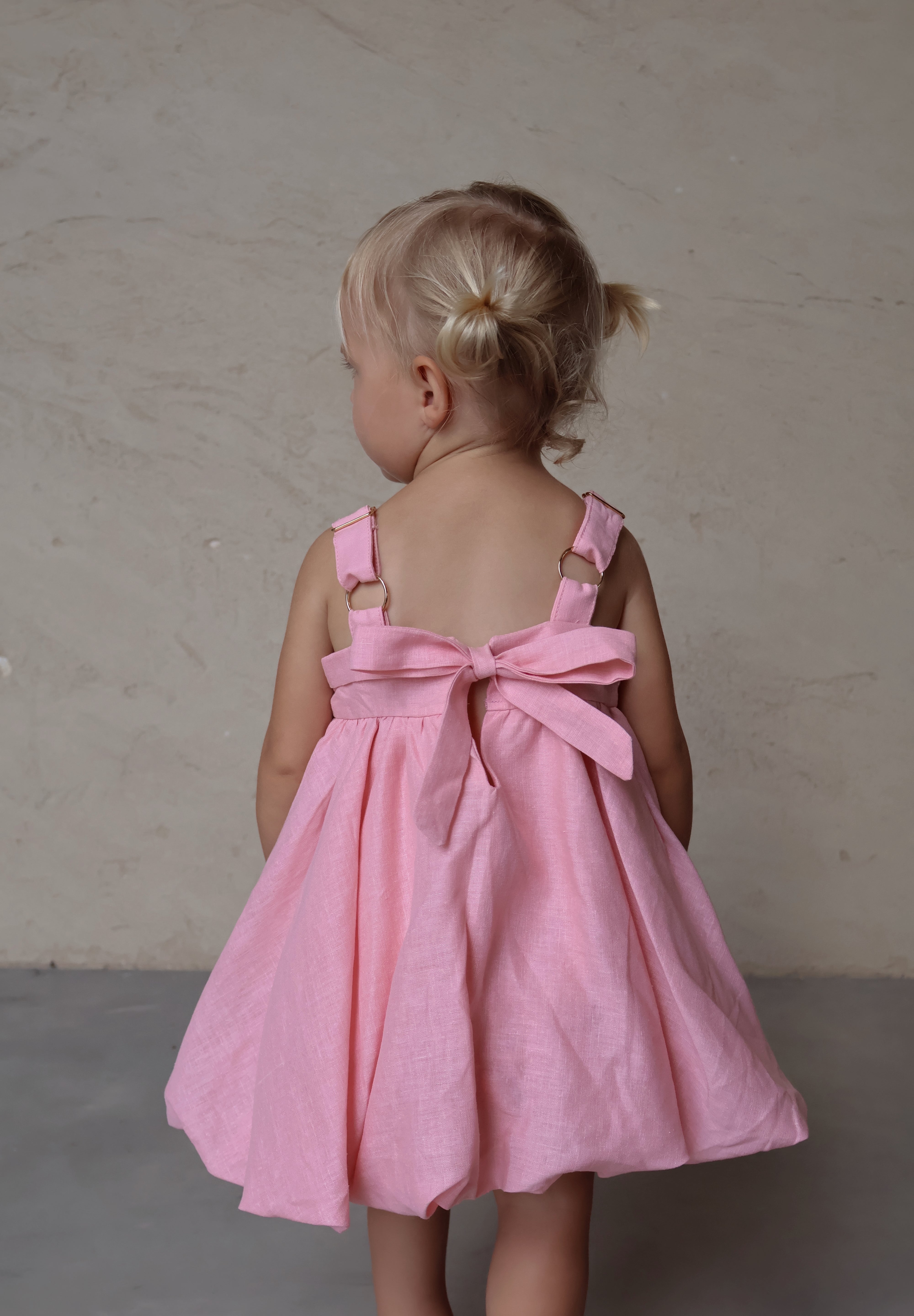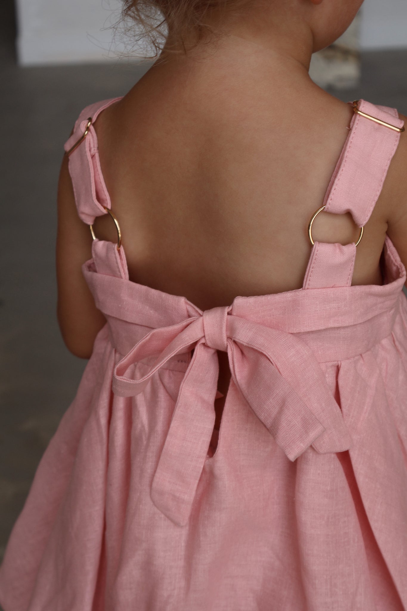 Our gorgeous rose baby doll dress is made from 100% soft linen in a beautiful rosey blush colour. Showcasing a mini bubble skirt, fixed waist and cut out detailing at the back with a gorgeous tie up bow. Its both dainty and elegant in its design. This dress is perfect for every occasion and features high quality gold coloured hardware which makes the straps adjustable to compliment longevity of wear.