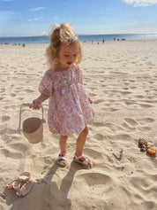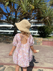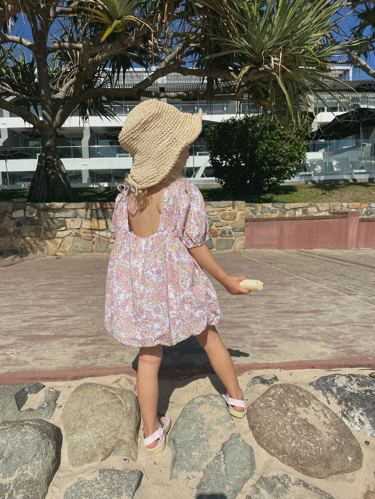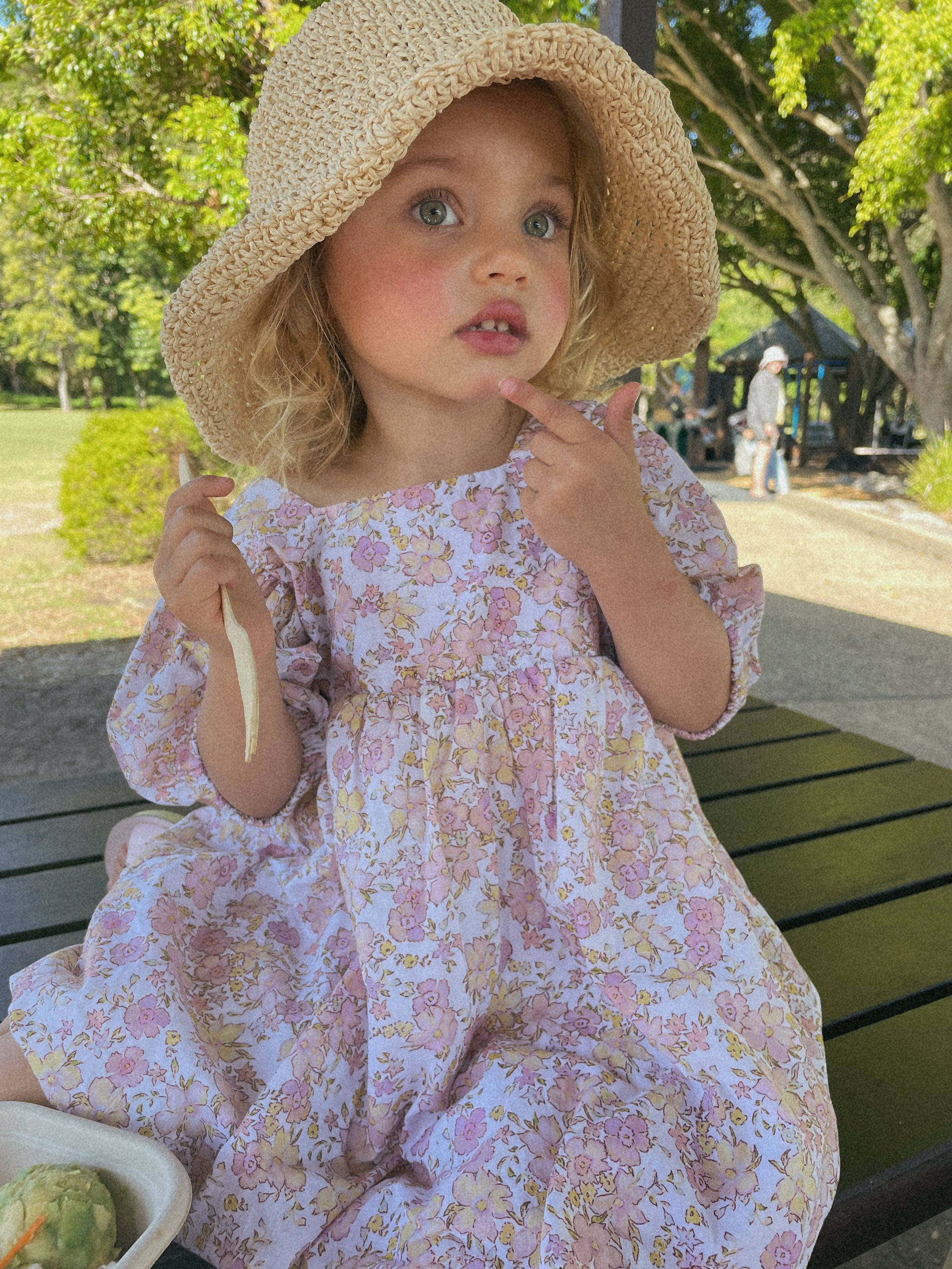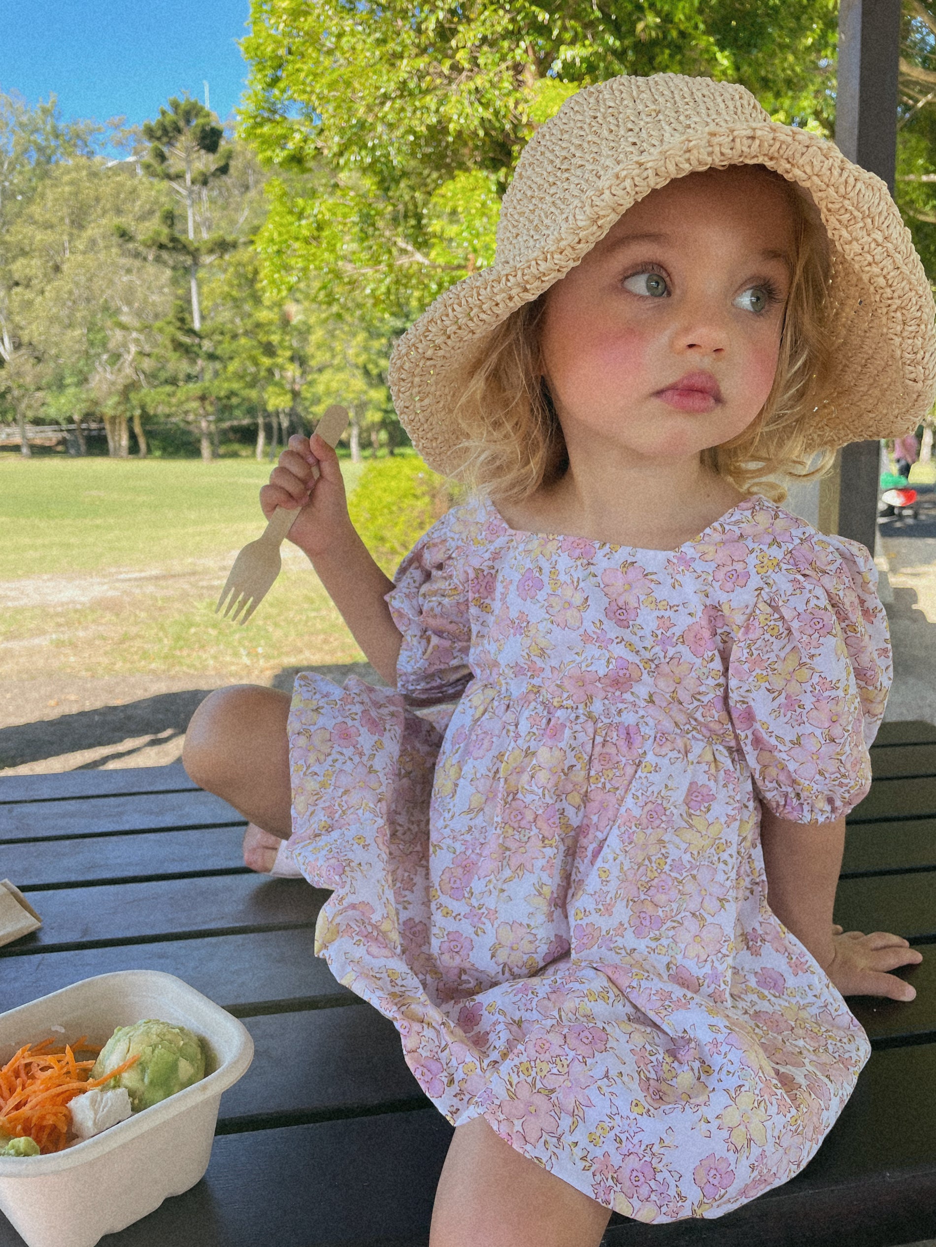 Our gorgeous puff dress in our exclusive hand painted Violet floral print and is designed to be lightweight and airy for your little ones to wear. It is made from the softest organic cotton and double lined. It features the most delicate details including the puffy sleeves and bubble hem. It also has a beautiful open back with dainty straps to be tied into a bow and an invisible zip at the back for easy wear. Your darling will want to twirl into the moonlight with this little number on.